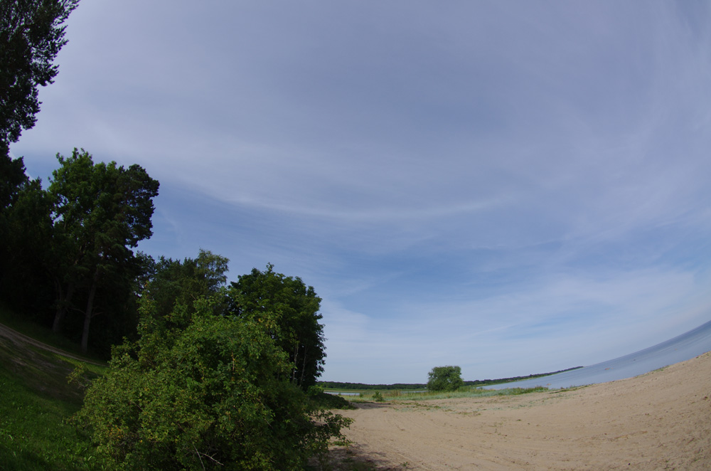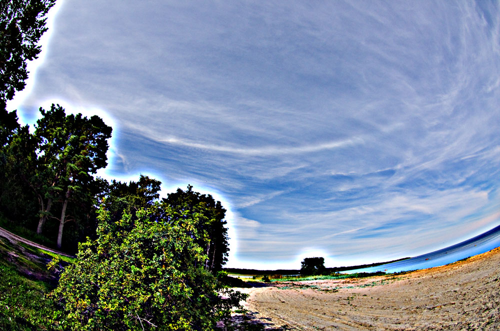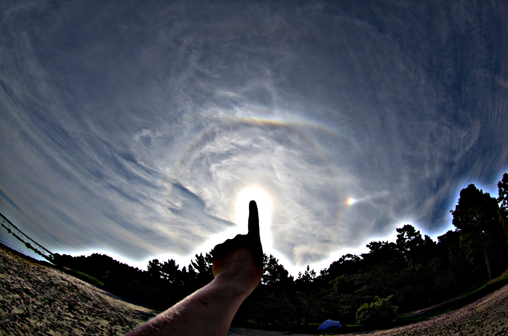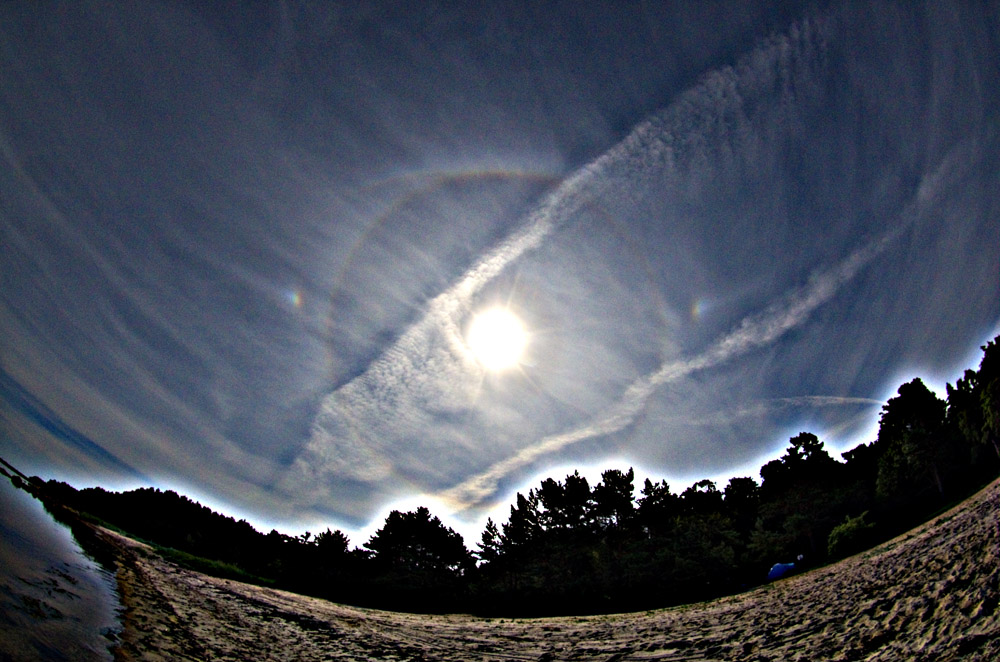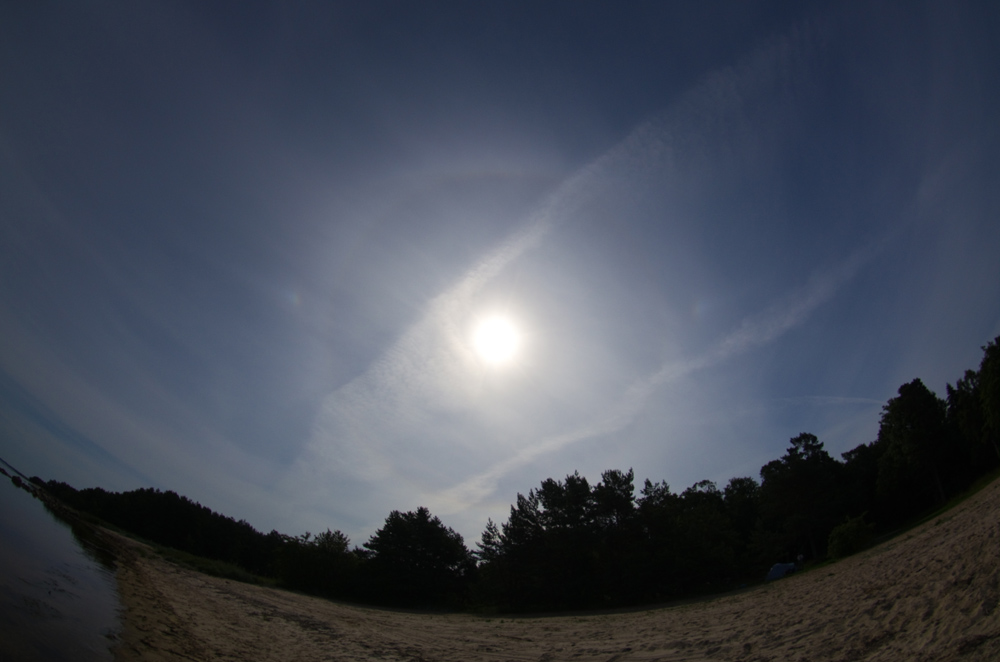 Schon der erste Blick in den Himmel nach dem Aufstehen gegen 07:00 MEZ machte klar, dass ein ernstzunehmender Halotag ins Haus stand: 22°-Ring, oberer Berührungsbogen, 22°-Nebensonnen, unvollständiger Horizontalkreis, Parrybogen, und etwas Buntes im 46°-Bereich über der Sonne – erst für einen ZZB gehalten, war aber der Supralateralbogen. Die Insektenplage vom Vorabend war nicht weniger geworden (hauptsächlich Fliegen, Bremsen und hornissengroße Pferdebremsen), da immer noch kaum ein Luftzug ging. Deswegen waren die anderen Mitfahrer auch kaum zum Verlassen der Zelte zu motivieren, und ich hatte die Halos und den Strand erstmal für mich alleine.