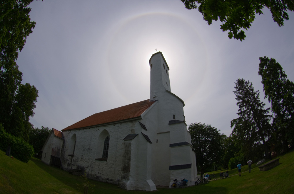 USM: Ein paar Kilometer nach dem Start der Tagesetappe kamen wir durch das Dorf Harju-Risti/Kreuz in Harrien mit seiner historischen Kirche, wo man auch einen Kaffee bekommen kann. Der Halo war noch da, und mit Bildbearbeitung zeigte sich, was da sonst noch alles ganz schwach versteckt war – gesehen hab ich nur den 22°-Ring mit Ansätzen des Umschriebenen, 10:51: