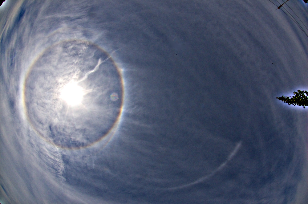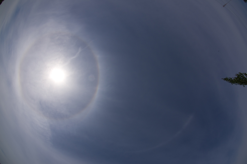 Nach und nach wurde es nun auch möglich, den 22°-Bereich unter der Sonne über den Bäumen zu beobachten. Auf dem Foto tauchte nach Bearbeitung noch ein schwacher 9°-Ring auf, der mir visuell nicht aufgefallen war. Auf späteren Bildern war er noch bis 9:30 zu sehen, als ansonsten nur noch der 22°-Ring mit Aufhellungen oben und unten durch den umschriebenen Halo übrig waren. Hier um 07:58: