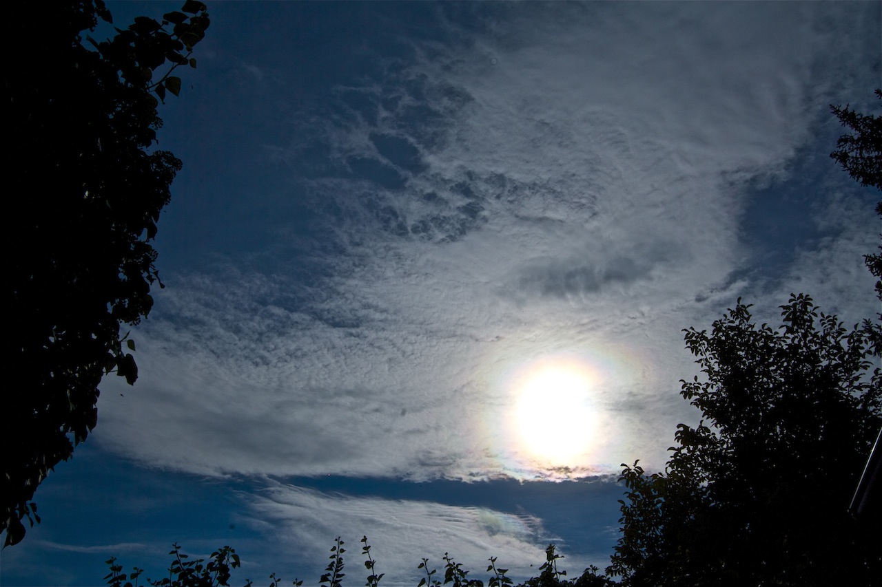 Ab Morgen ist für die Ostalpen heftiger Föhn angesagt. Heute Nachmittag wurde schon an den Ac´s geknabbert, Wärme zieht ein und die Bewölkung löst sich gen Abend nach und nach auf. Dabei zeigte sich um die Sonne eine intensive Aureole, bin mal gespannt, ob sich morgen im Föhn wieder farbige Ränder an den Ac´s bilden werden oder gar Punch-Hole Clouds entstehen.