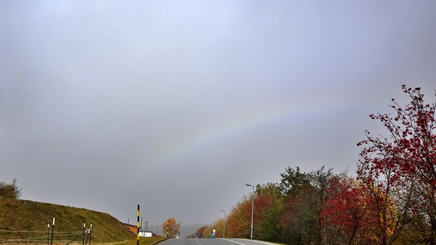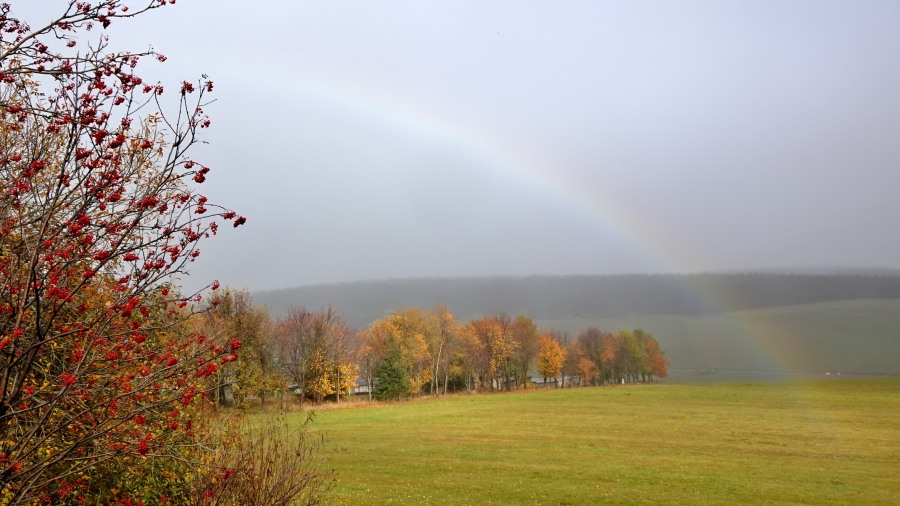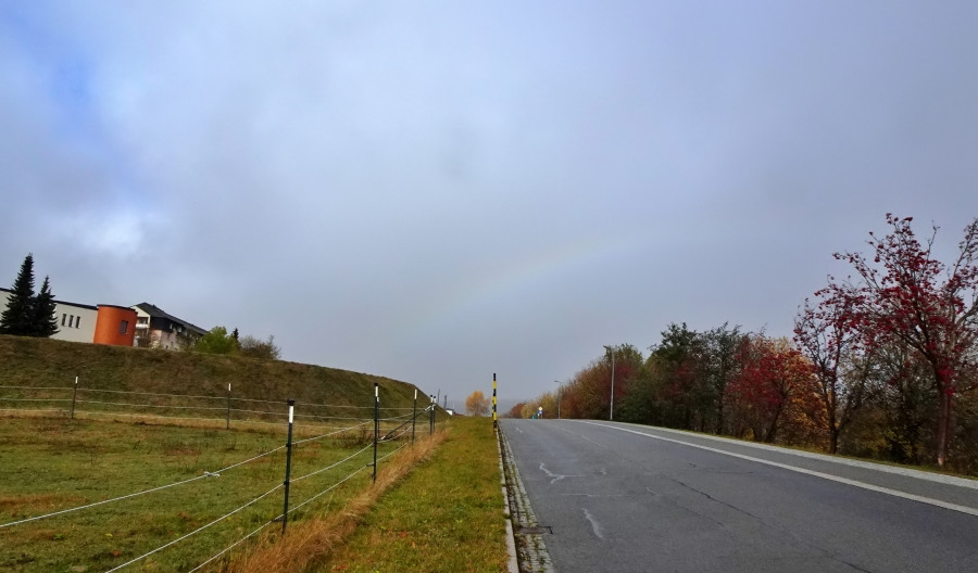 Heute waren wir in Oberwiesenthal, wo es entgegen aller Vorhersagen mäßigen Sprühregen gab. Dann kam kurz die Sonne heraus und auf der Straße vor uns bildete sich ein blasser Sprühregenbogen. Aufgrund der winzigen Tröpfchen sind die Farben ausgewaschene und deutlich schwächer als beim Regenbogen, aber er ist noch nicht weiß, wie ein Nebelbogen.
