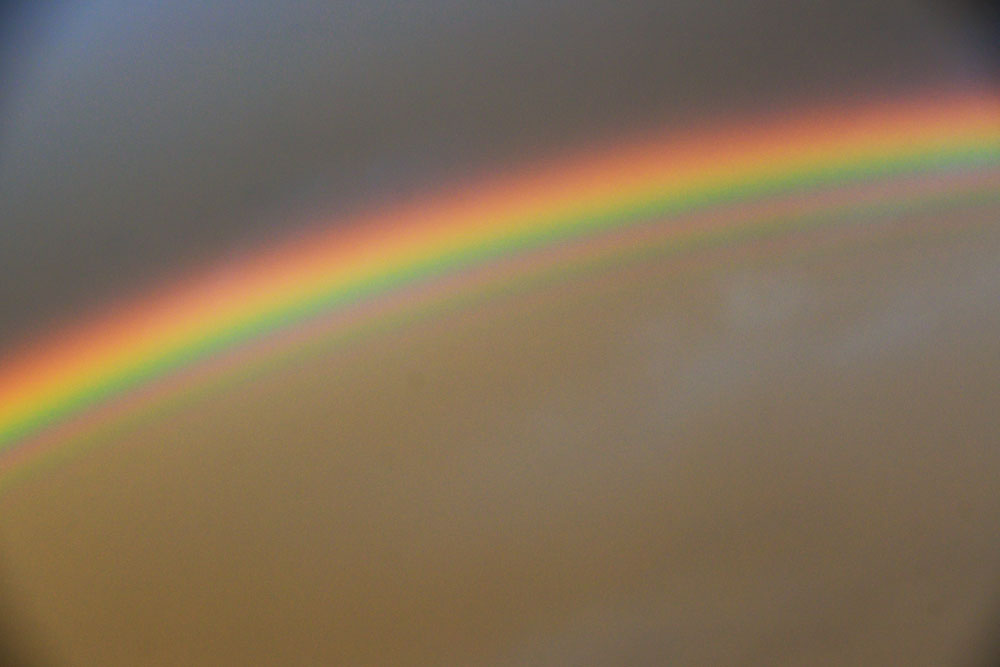gestern konnte ich bei relativ hohem Sonnenstand einen Regenbogen beobachten. Die erste Ordnung war noch unter dem Horizont, lediglich die zweite Ordnung war schwach zu sehen.