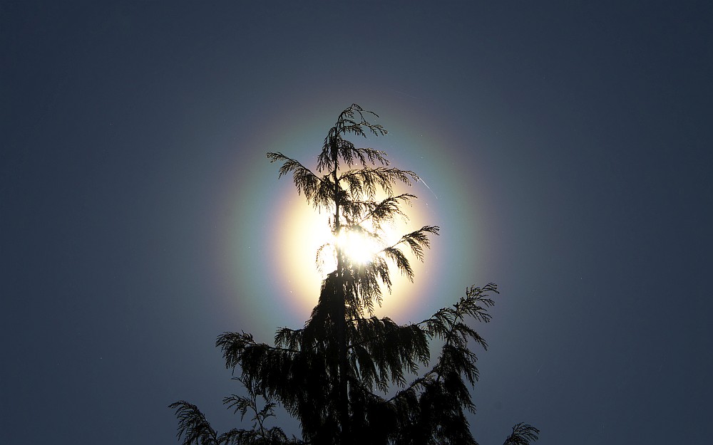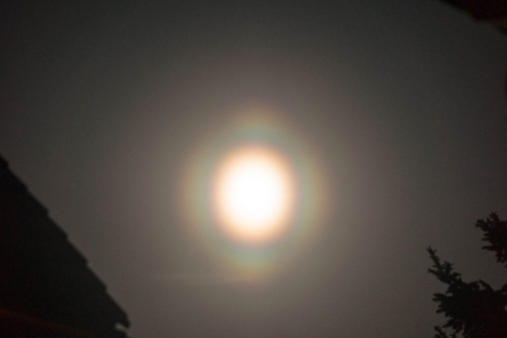 das ist kein atmosphärisches Wischiwaschi und auch kein Halo, sondern eine seltene Pollenkorona der Kiefer. Das Licht der Sonne oder des Mondes wird an den Pollen gebeugt und erzeugt diese Erscheinung.