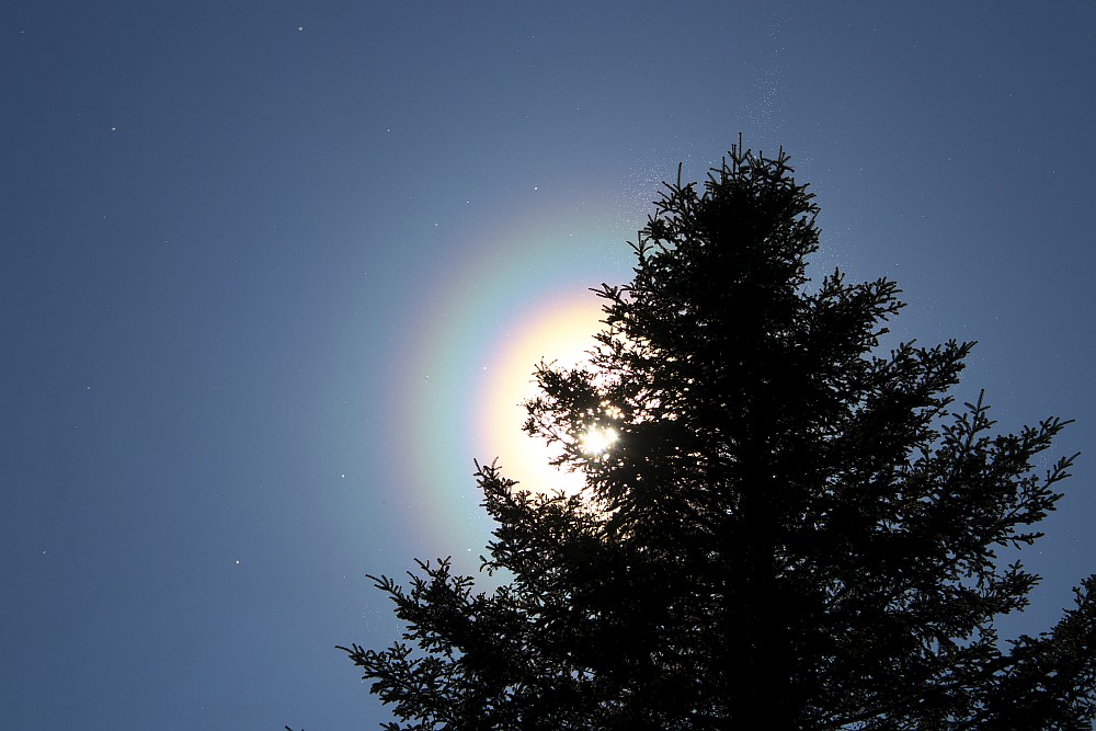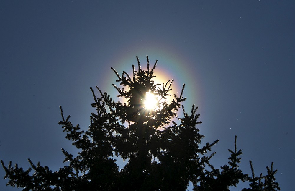 Also doch falscher Alarm, das war wahrscheinlich ein Kranz in dünnem Cirrostratus, und für Fichtenpollen auch zu groß im Winkeldurchmesser.