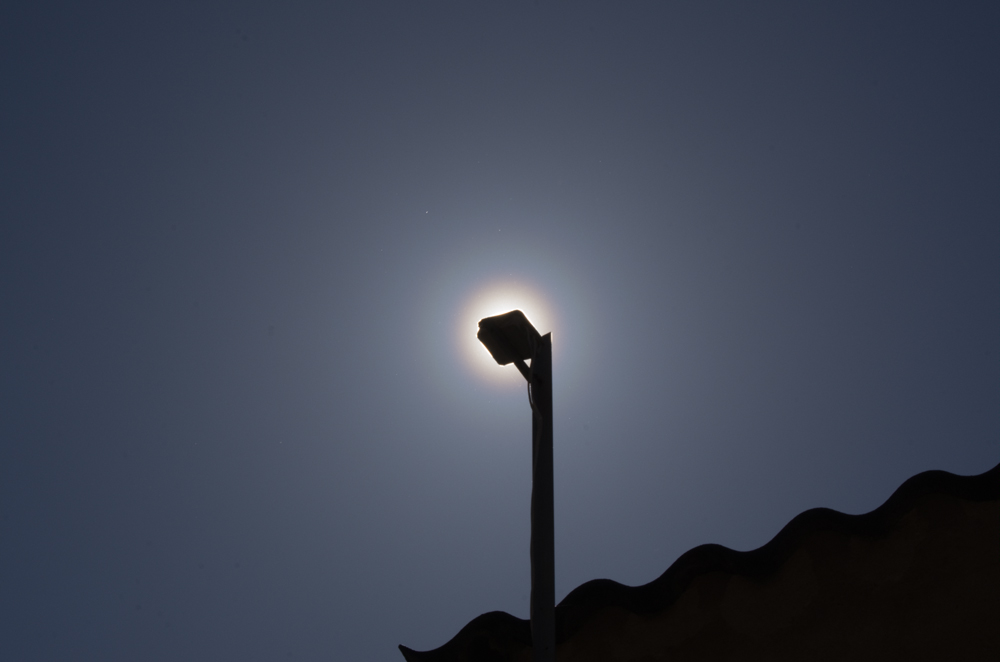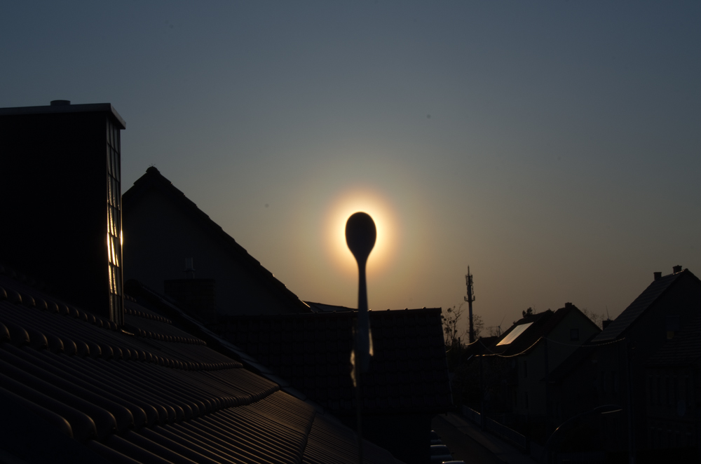 Und um 18:31 MESZ in Hörlitz - dieses mal nun endlich der direkte Beweis für eine Pollenkorona durch die unrunde Form und die Lichtknoten: R-G: (f = 95 mm an Pentax K-5)