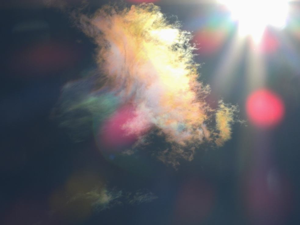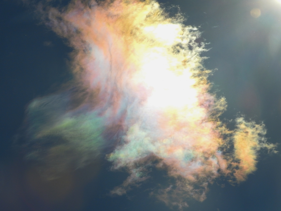 Hallo, vor ca. 1/2 Stunde, 15:27 Uhr MESZ, entdeckte ich diese wunderschön irisierende Wolke. Sie hielt sich mit leichten Veränderungen für ca. fünf Minuten. Hoffe jedenfalls, dass es sich um eine irisierende Wolke handelt. Kenne sie bisher nur von Bildern.