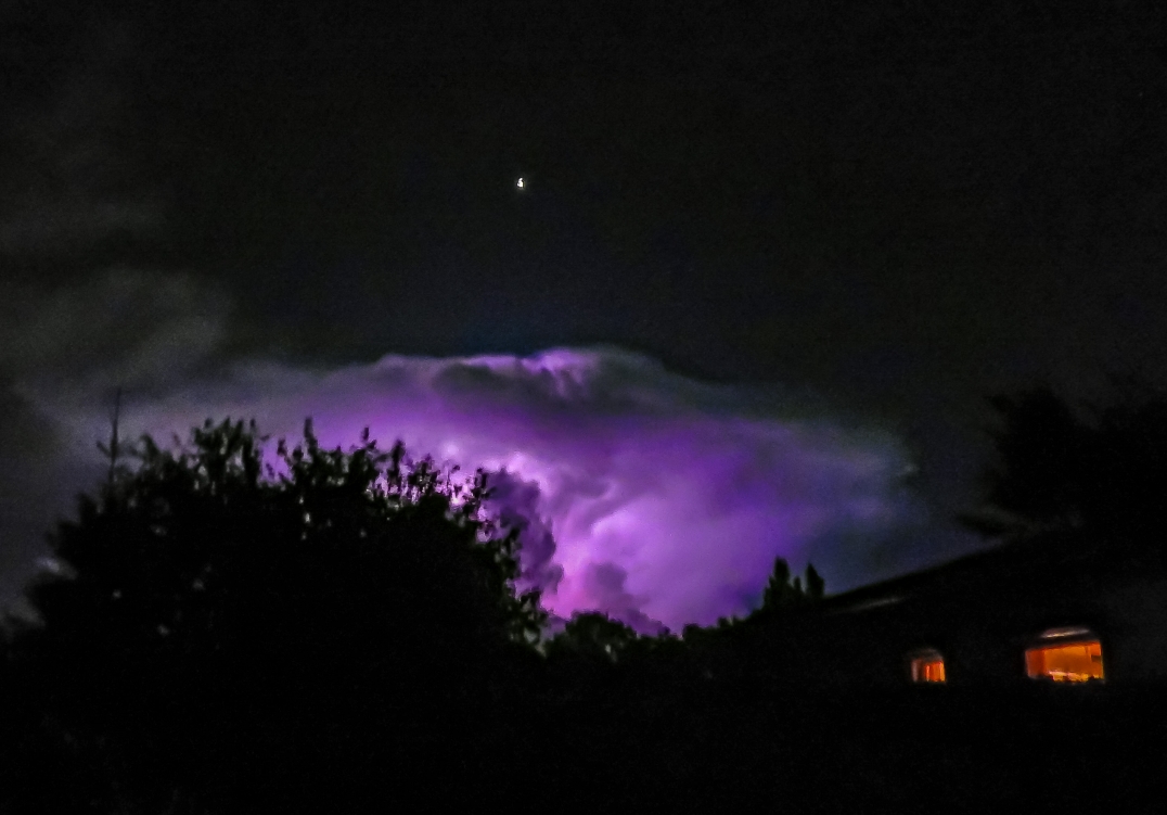 Hallo, wir hatten hier gestern Abend zwischen 22:00 Uhr und 23:00 Uhr MESZ herrliches Wetterleuchten. Die Farben zeigten sich bei der Bearbeitung mit Photoshop Express durch leichte Verstärkung der Farbdynamik.