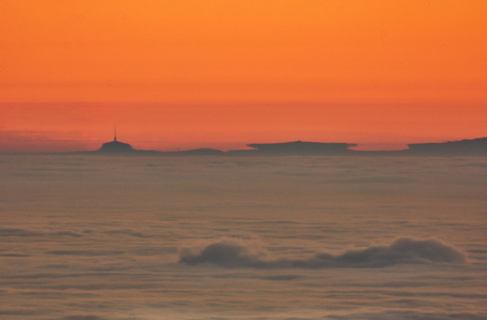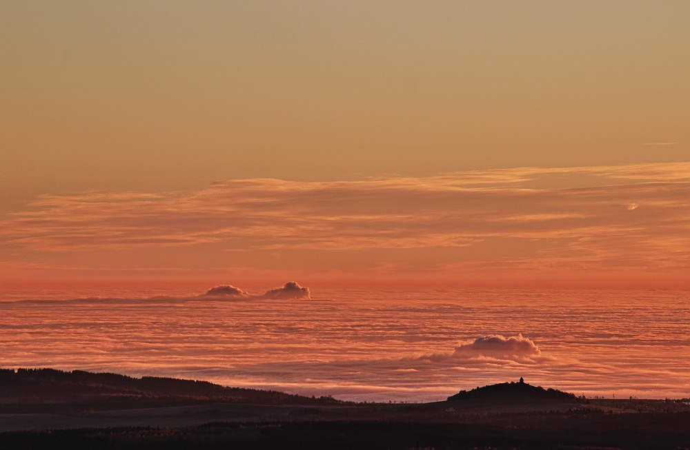 da sich auf den Bergen eine starke Inversionswetterlage eingestellt hat (zum Sonnenaufgang: Fichtelberg, 1214m: 11°C, Hammerunterwiesenthal, 778m: -4°C) sind wir heute zum Sonnenaufgang auf den Fichtelberg gefahren, in der Hoffnung, daß er wieder einige Refraktionseffekte für uns bereit hält. Und tatsächlich bot sich zum Sonnenaufgang über ca. 750m hohem Nebelmeer eine phantastische Show mit zartem Morgenrot, unzähligen Grünen Strahlen, Luftspiegelungen und einer phantastischen Fernsicht bis zum 180-220km entfernten Riesengebirge.