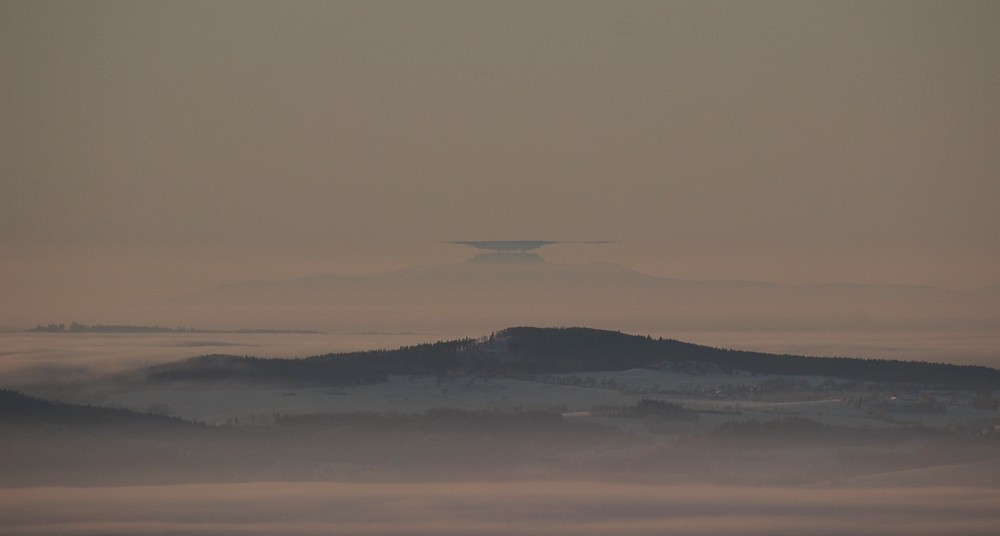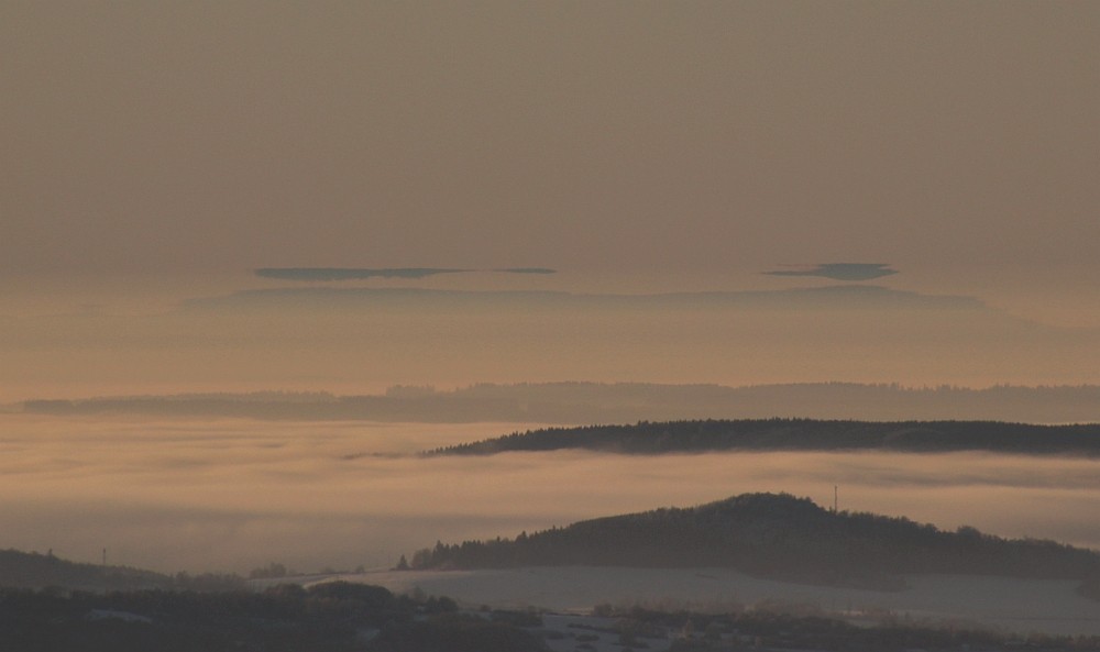 Vor Ort bestätigte sich dann die Skepsis, die Obergrenze des Böhmischen Nebels lag auf etwa 900 Meter, zu tief für Eisnebelhalos, aber genau richtig für den Grünen Strahl und Luftspiegelungen. Der Grüne Strahl zeigte sich mehrfach, allerdings war die Sonne aufgrund der trockenen Luft gleich so hell, dass er visuell kaum noch auszumachen war und auch die Kamerablende nicht mehr ausreichte. Gleichzeitig änderten sich Luftspiegelungen am 160km entfernten Bayrischen Wald im Minutentakt, aber auch am näheren Fichtelgebirge waren immer mal wieder Spiegelungsansätze zu sehen. Insofern sind wir noch nach Neklid gefahren, wo man freien Blick auf die schönen Spiegelungen hatte.