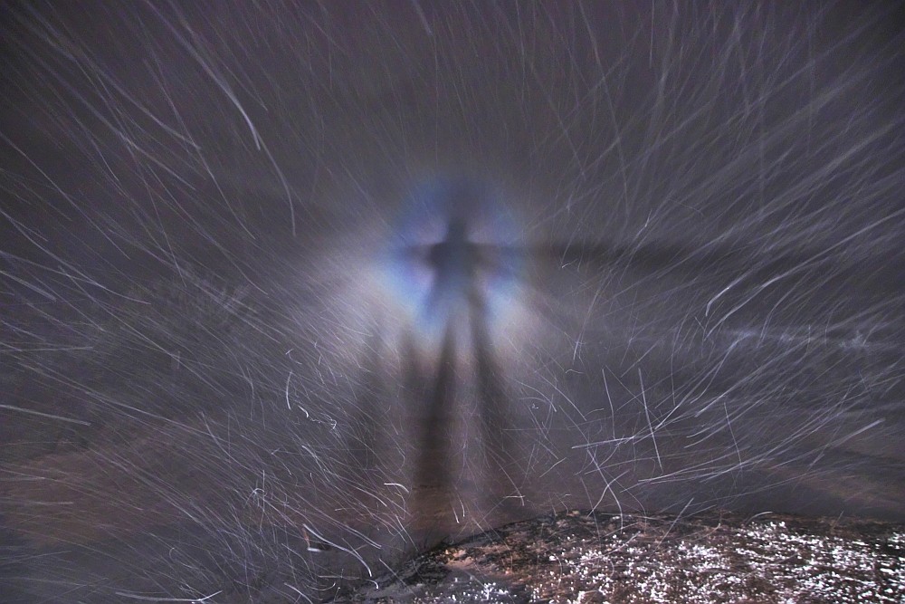 Künstliche an den Autoscheinwerfern erzeugte Brockengespenstzwillinge mit siamesischer Glorie auf dem Fichtelberg im Nebel und starken Schneefall