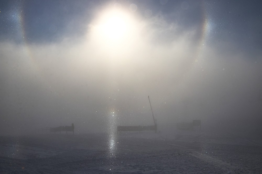 Sind dann an die Kante, also in den Nebel rein gegangen, als sich tatsächlich 22°-Ring mit beiden Nebensonnen, unterer Berührungsbogen, untere Lichtsäule sowie Unter- und Unternebensonnen zusammenglitzerten. Ich rannte schnell ins Auto, um das Weitwinkel zu holen, aber da war schon alles vorbei. Wir nehmen an, dass weiter unten im kälteren Böhmischen Nebel noch irgendwo Schneekanonen in Betrieb waren. Oben waren auf jeden Fall schon alle aus. Oder es war einfach 'ne kurze Begrüßung ... extra für uns ... wer weiß das schon ...