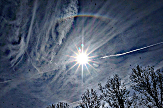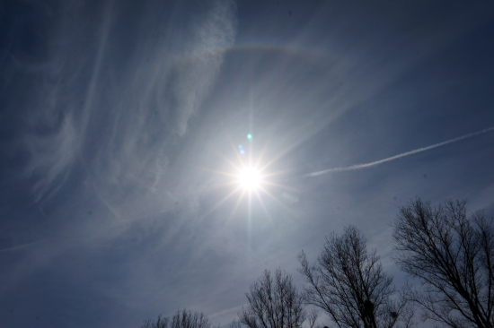 Am heutigem Ostermontag zog aus Westen großflächig Cirrostratus auf, sodass ich mich zur Beobachtung von möglichen Halos nach draußen begab. Ab nachmittags zeigte sich dann ein Fragment des 22°-Ringes und ein Teil des umschriebenen Halos: