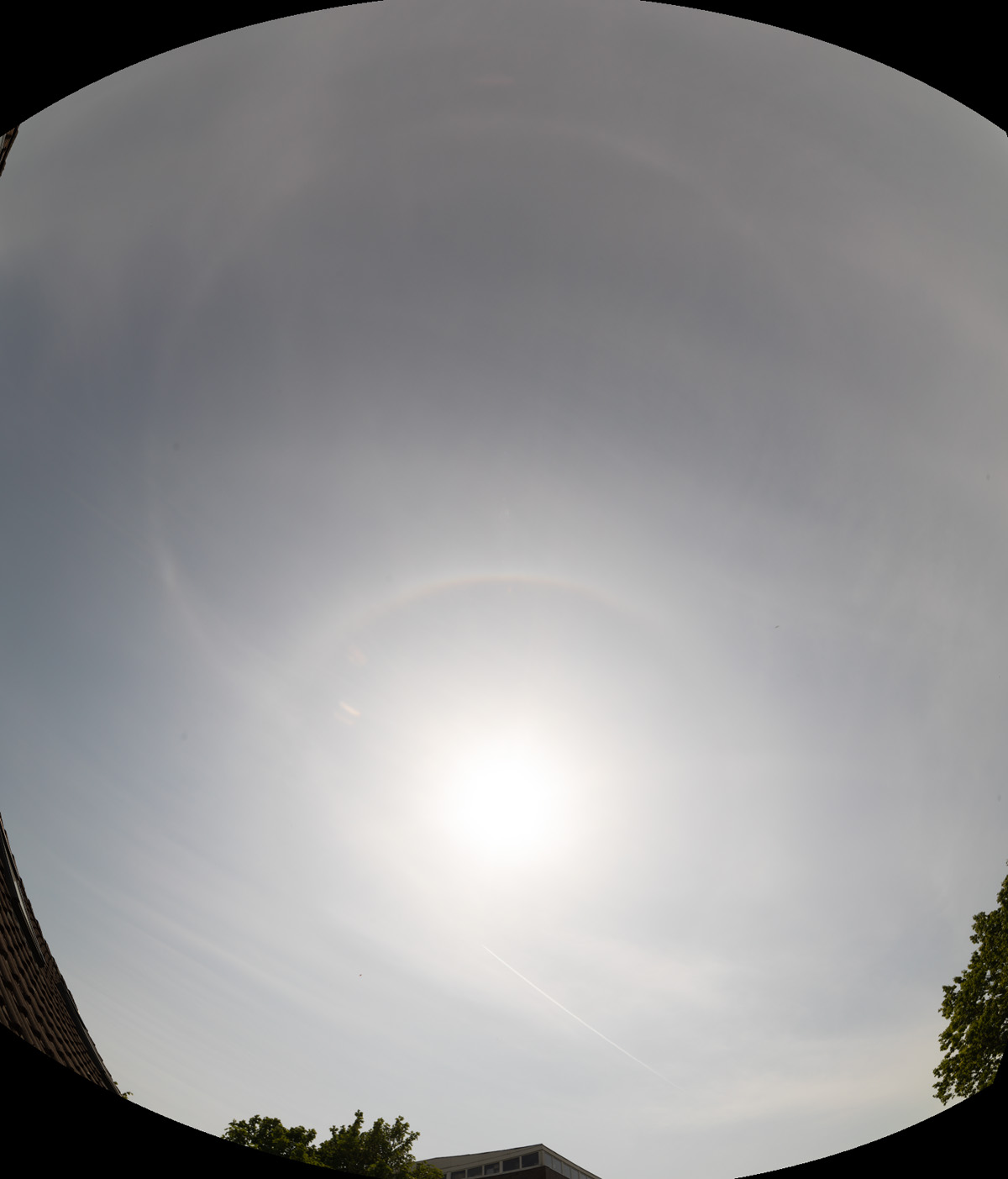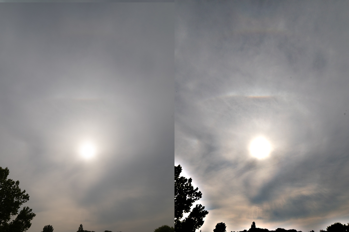 Gegen Mittag waren die Zirren gleichmäßiger und es bildete sich ein heller Oberer Berührungsbogen sowie ein schwacher, Umschriebener Halo. Dazu bemerkte ich auf einmal einen vollständigen Horizontalkreis!