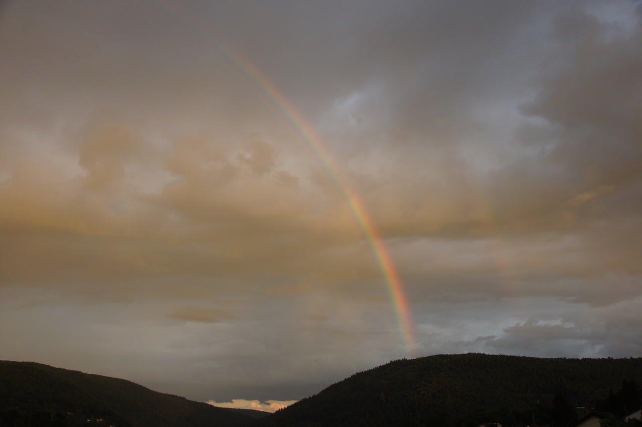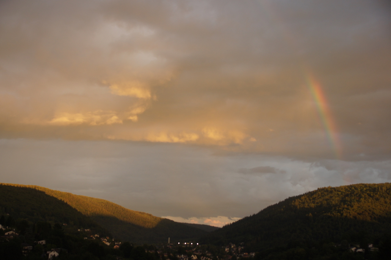 binnen eines Monats hat es hier in Heidelberg drei phantastische Regenbögen gegeben. Der heutige war der spektakulärste, nicht nur, weil er "leise" daherkam (quasi ohne Regen) – ich wurde auf die Situation aufmerksam, als die fast schon untergehende Sonne durchbrach und ich vermutete, es könnte einen Regenbogen geben. Ich wurde nicht enttäuscht.