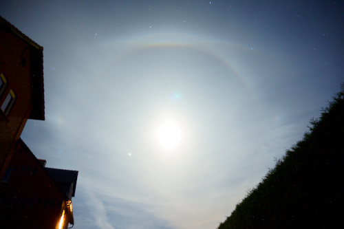 da denkt man, der gestrige Tag war in Sachen Halos schon gut genug und dann kommt noch so etwas: nachdem gestern Abend bereits um den Mond ein paar Halos vorhanden waren (unter anderem Nebenmonde, Lichtsäulen, 22er und wohl HZK), wollte ich eigentlich nur mal kurz die Lage checken, da nach wie vor der Himmel mit Cirrostratus überzogen war. Da fiel mir direkt ein sehr waagerechter Bogen im oberen Bereich des 22ers auf. Nach Sicht der Bilder traute ich meinen Augen nicht: ein heller Parrybogen zusammen mit 22°-Ring, OBB und oberen kreisrunden Lowitzbogen. Selbstverständlich waren auch noch die Nebenmonde vorhanden, offensichtlich auch mit einem HZK-Fragment: