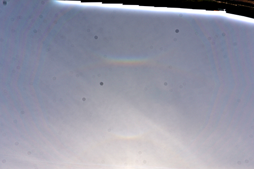 Später wurde der Parrybogen dann eindeutiger, während die Nebensonnen verschwanden. Dafür kamen ein paar Pyramidal-Halos dazu: Sichtbar: 9°-Ring, 18°-Ring (besonders rechts erkennbar), 22°-Ring, OBB und Parrybogen.