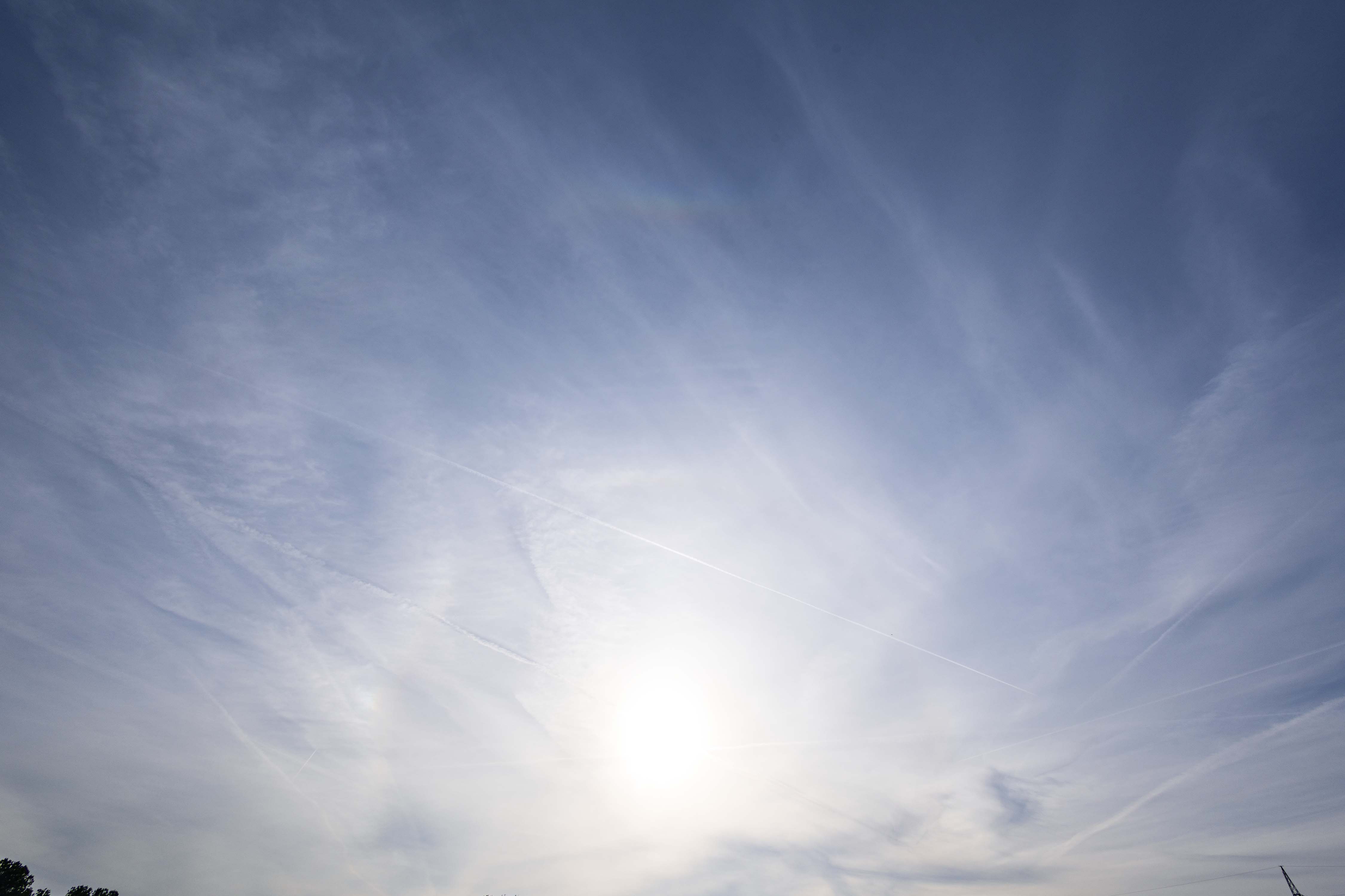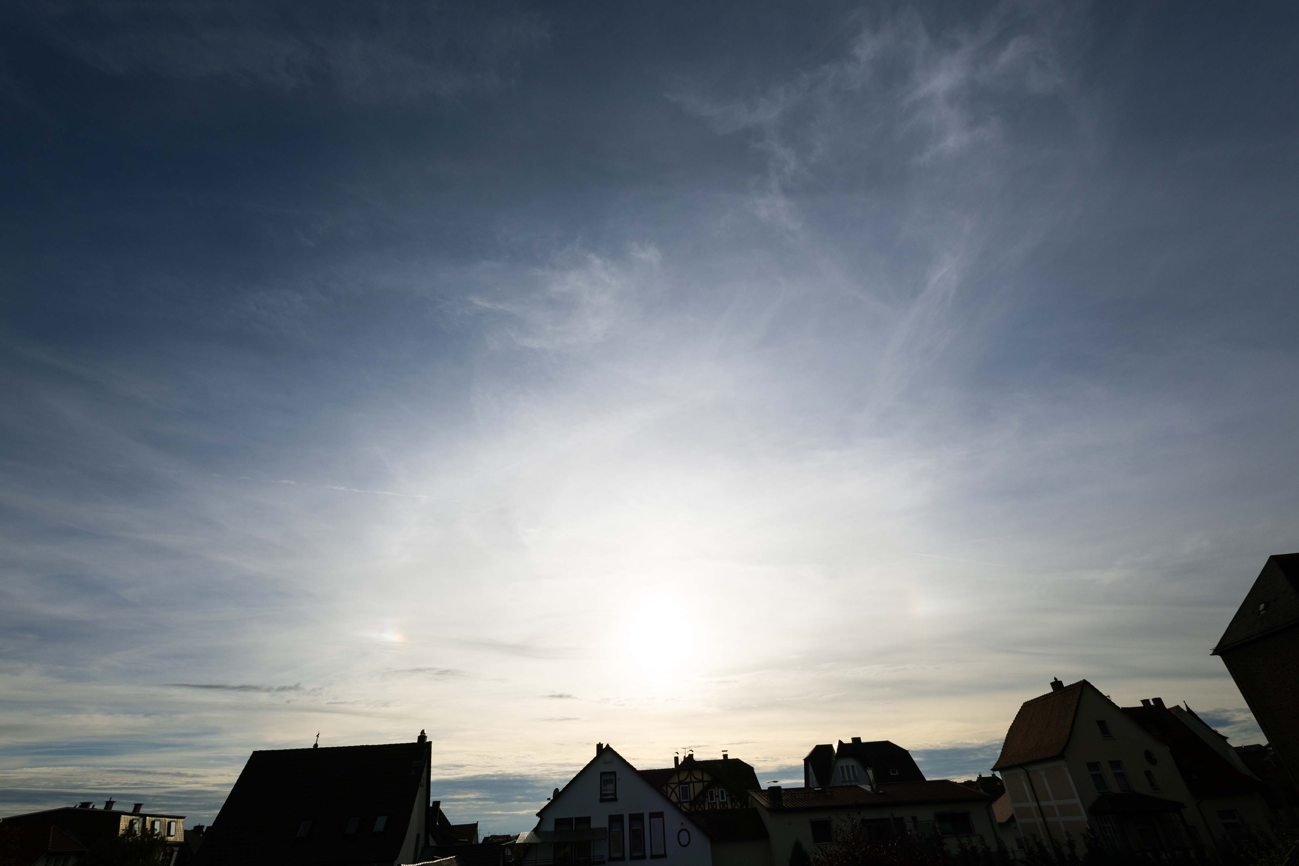 nach einem teils intensiven Morgenrot konnte ich bereits nach Sonnenaufgang die Nebensonnen sichten. Da ich von Zuhause aus keinen freien Blick nach Osten und Südosten habe, entschied ich mich ins Feld zu gehen. Dort konnte ich bis zur Mittagszeit einiges festhalten, bevor sich dann Altocumulus vor die Sonne und die hohen Eiswolken schob. Hier ein Einzelfoto zum Höhepunkt der Halo-Aktivität gegen 10:30 Uhr MESZ und einer Sonnenhöhe von 20°: