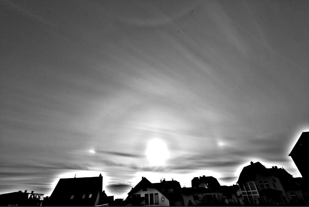 Später gegen 16:30 Uhr gesellten sich dann noch die Nebensonnen, der ZZB und HZK (an der rechten Nebensonne) dazu: Insbesondere der 46°-Ring kommt oben viel besser heraus.