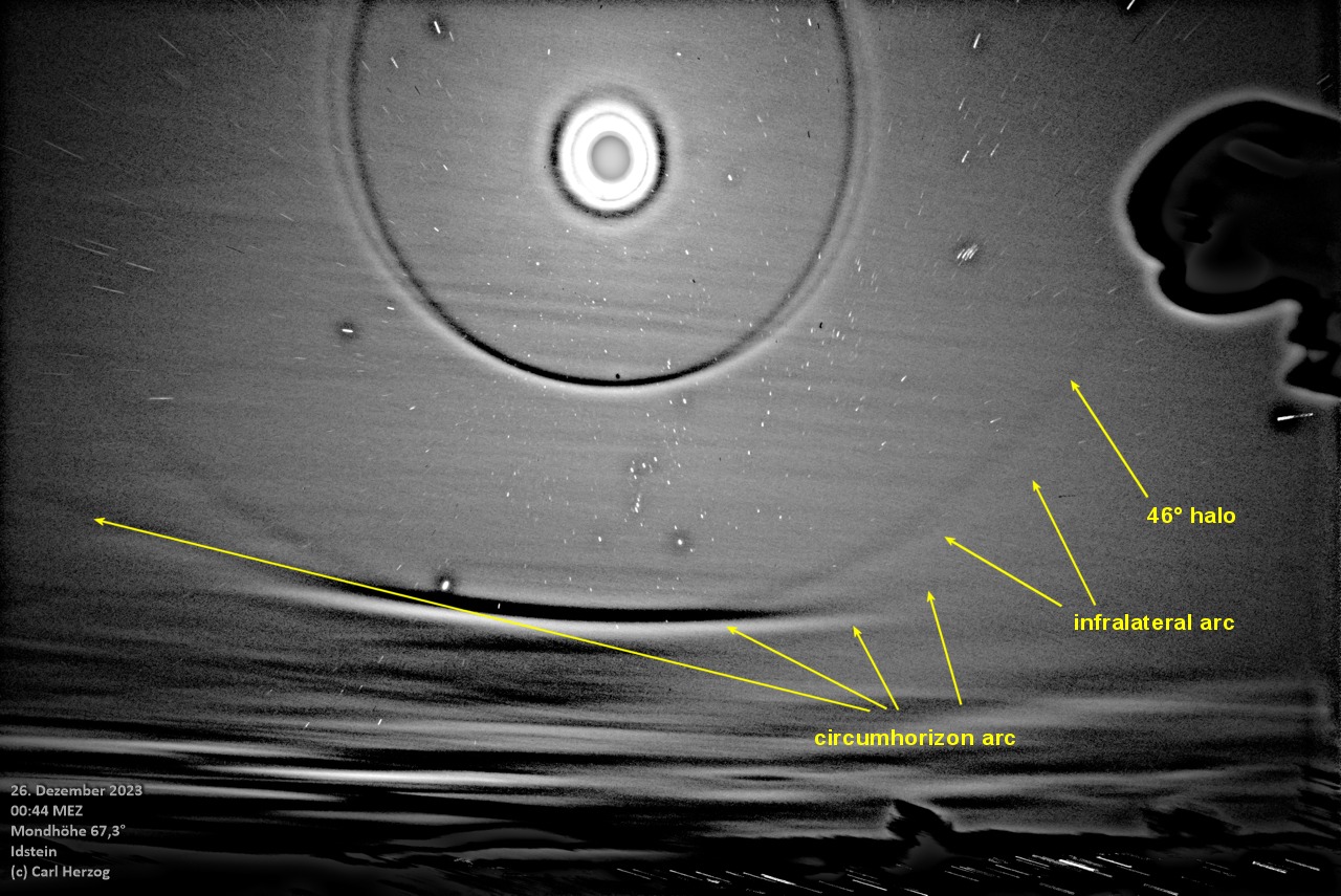 nach einem halotechnisch sehr schwierigen Monat scheint sich das Blatt nun zu wenden. Gestern Nacht konnte ich erstmalig den Zirkumhorizontalbogen am Mond bei einer Mondhöhe von 67,3° aufzeichnen. Die Aufnahmen wurden mit 14mm Brennweite auf Vollformat geschossen.