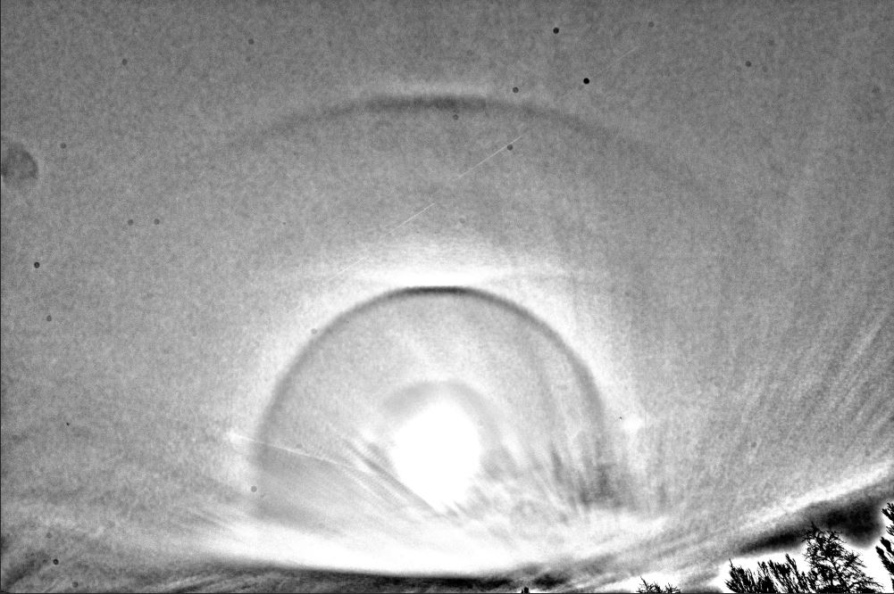 das kam ja dann doch etwas überraschend: nachdem hier in Kirchhain nach viel Regen in den letzten Tagen endlich mal das tiefe Gewölk auflockerte und somit auch mal die Sicht auf hohe Eiswolken freigab, konnte ich um die Mittagszeit einen ausgeprägten 22°-Ring, OBB und einen deutlich sichtbaren und bunten Bogen im 46°-Bereich erkennen. Also raus und Fotos geschossen, hier das Resultat (mit USM zur besseren Kenntlichkeit):