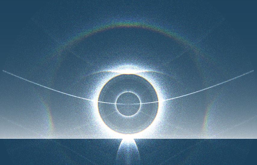 Da ich mindestens 9 Halos gleichzeitig festhalten konnte, handelte es sich somit um ein Halophänomen. Normalerweise lassen sich SLB und 46°-Ring bei diesem Sonnenstand nicht wirklich gut unterscheiden. Besonders bei der ersten Beobachtung in der RB-Methode wird aber links und rechts eine Aufspaltung erkennbar. Der obere Bogen ist dabei der SLB und der untere der 46°-Ring, es waren also beide vorhanden. Zum Vergleich mal eine Simulation mit HaloSim: