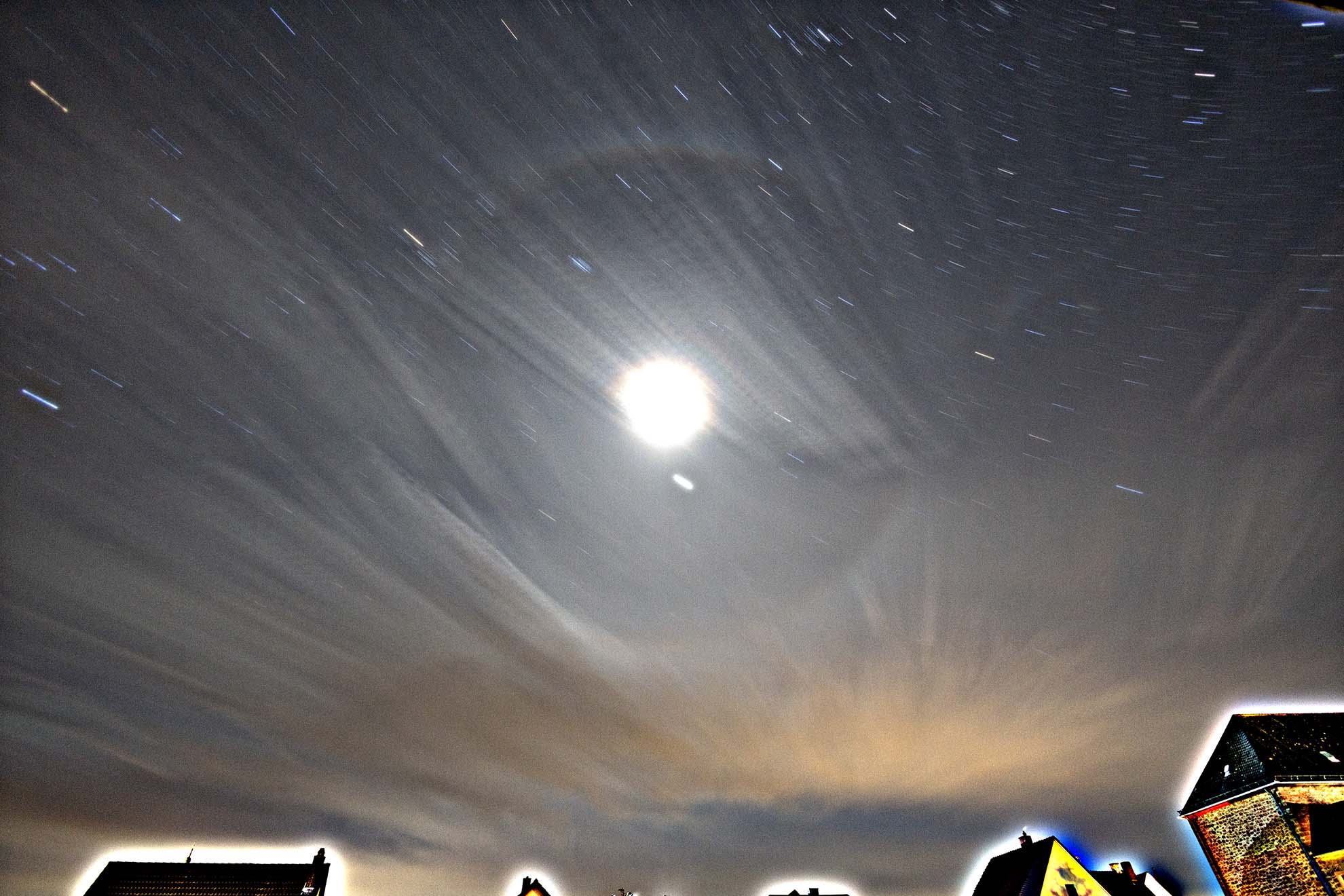 jetzt wo Du die Lichtsäulen erwähnst, habe ich mal ein Stack ohne Ausrichtung am Mond gemacht (daher ercheinen die Mondhalos verschwommen). Und tatsächlich sind schwächere Lichtsäulen zu erkennen (unten links und unten mittig):