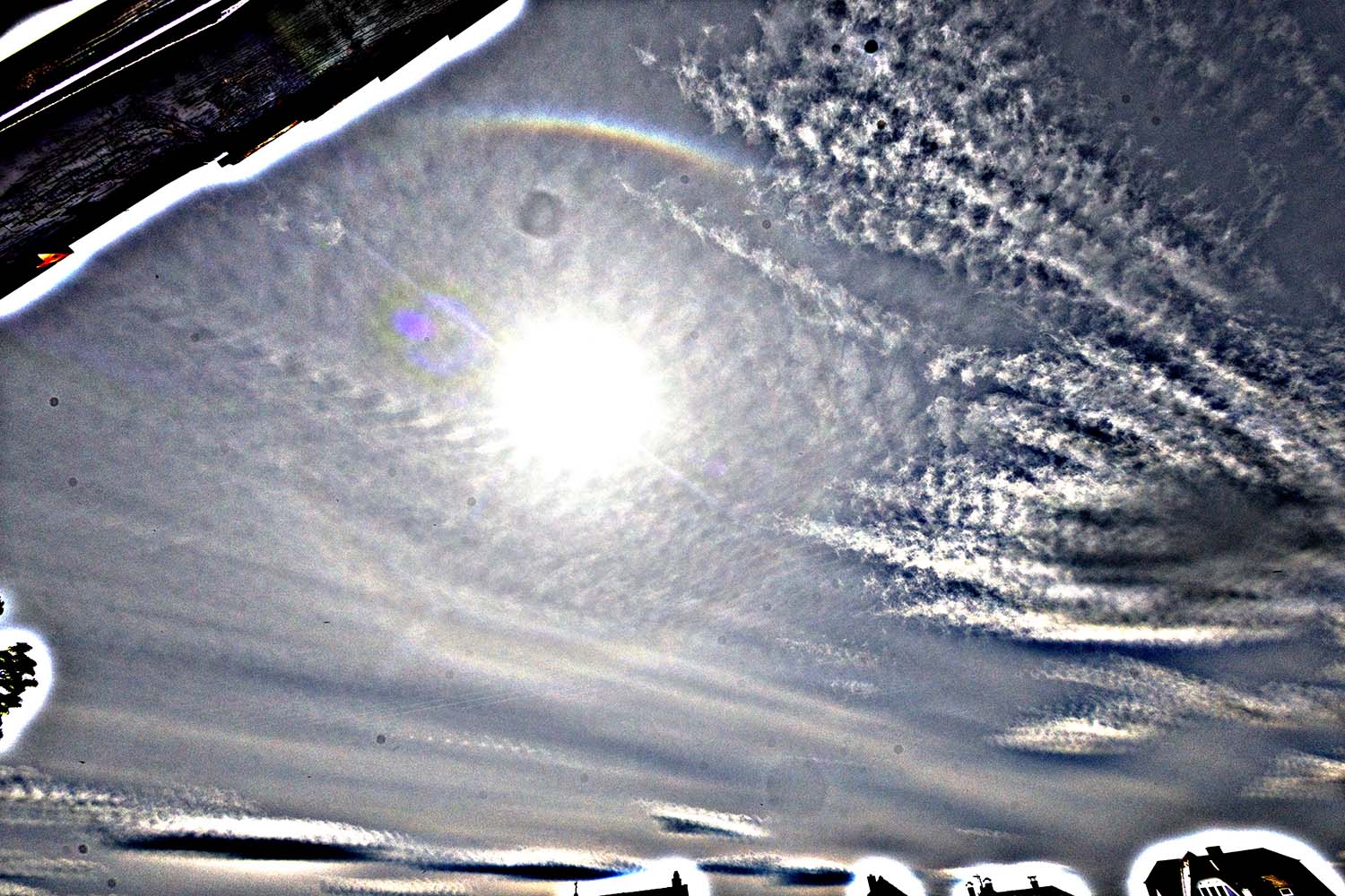 Vorhanden waren 22°-Ring, die Nebensonnen, OBB (eher schwach ausgeprägt), ZZB, Horizontalkreis als Fragment, 9°-Ring (sehr schwach, besonders oben und rechts erkennbar) und 46°-Ring (22er stärker ausgeprägt als OBB). Eventuell ist auch noch ein sehr schwacher Parry dabei, stufe ich aber mal als Verdacht ein, da nicht eindeutig genug.