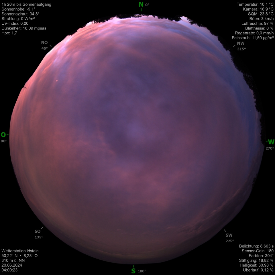 Ergänzend zum Thema Purpurlicht, hier eine kleine Sequenz von heute (25.06.2024) morgen bei klarstem Himmel im 20-Minuten-Abstand. Die Kamera schaut Richtung Norden, die Purpulfarbe lässt sich ab dem zweiten Bild (-12,6° Sonnenstand) erkennen. Der Sonnenstand lässt sich unten im Bild neben der Uhrzeit ablesen:
