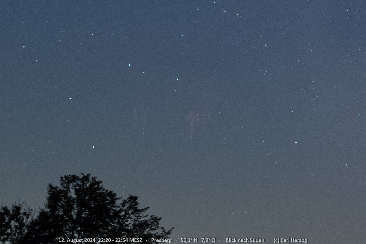 Die Aufnahmen entstanden in der Perseiden-/Polarlicht-Nacht mit einer astromodifzierten Kamera, und die Treffer waren ganz zufällig. Die Optik und die Einstellungen waren entsprechend suboptimal für Sprites (28mm, 4s, F2.2). Zur betreffenden Uhrzeit (22:20 bis 22:54 MESZ) gab es Gewitterwolken in weiter Entfernung, einmal gesichert im Norden, und zum anderen glaube ich auch im Süden (da haben ein paar Grad Horizontblick gefehlt, um es sicher sagen zu können, aber die DWD-App hat südlich von Karlsruhe was angezeigt, also mehr als 130 km Luftlinie).