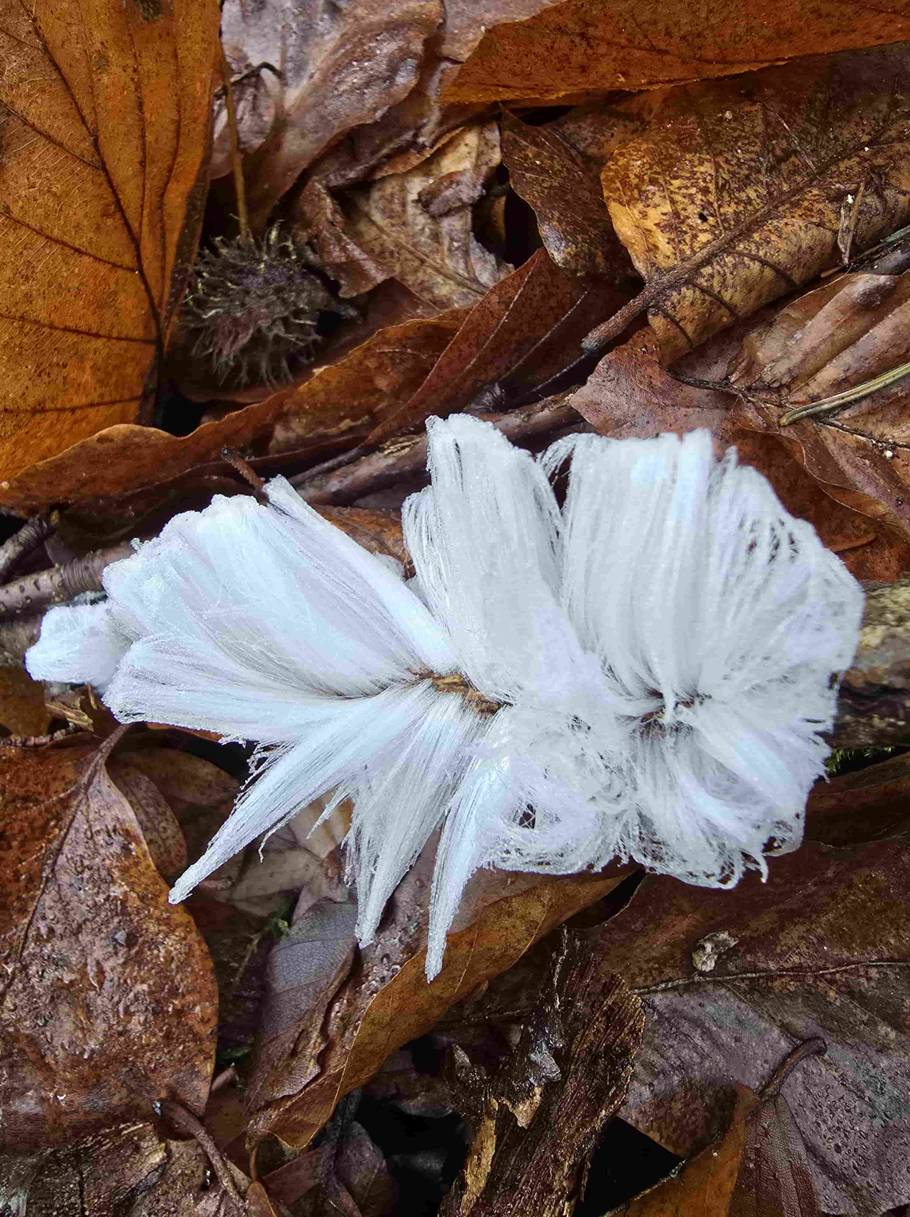 Ich hatte auch im Dezember 2024 die Möglichkeit, das erste Mal Haareis zu sehen und zu fotografieren. Ich war sehr fasziniert. Hier ein paar Fotos davon.