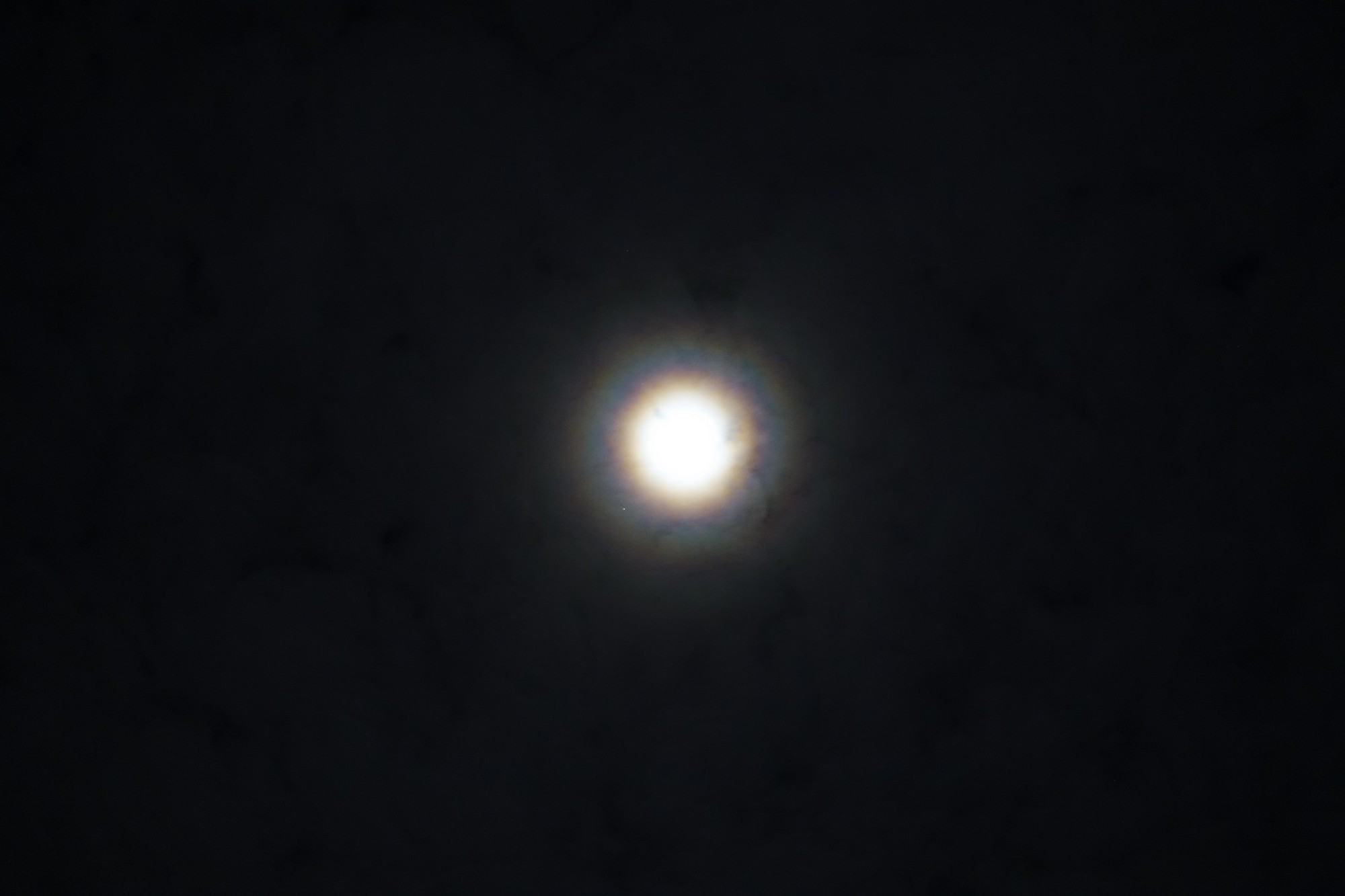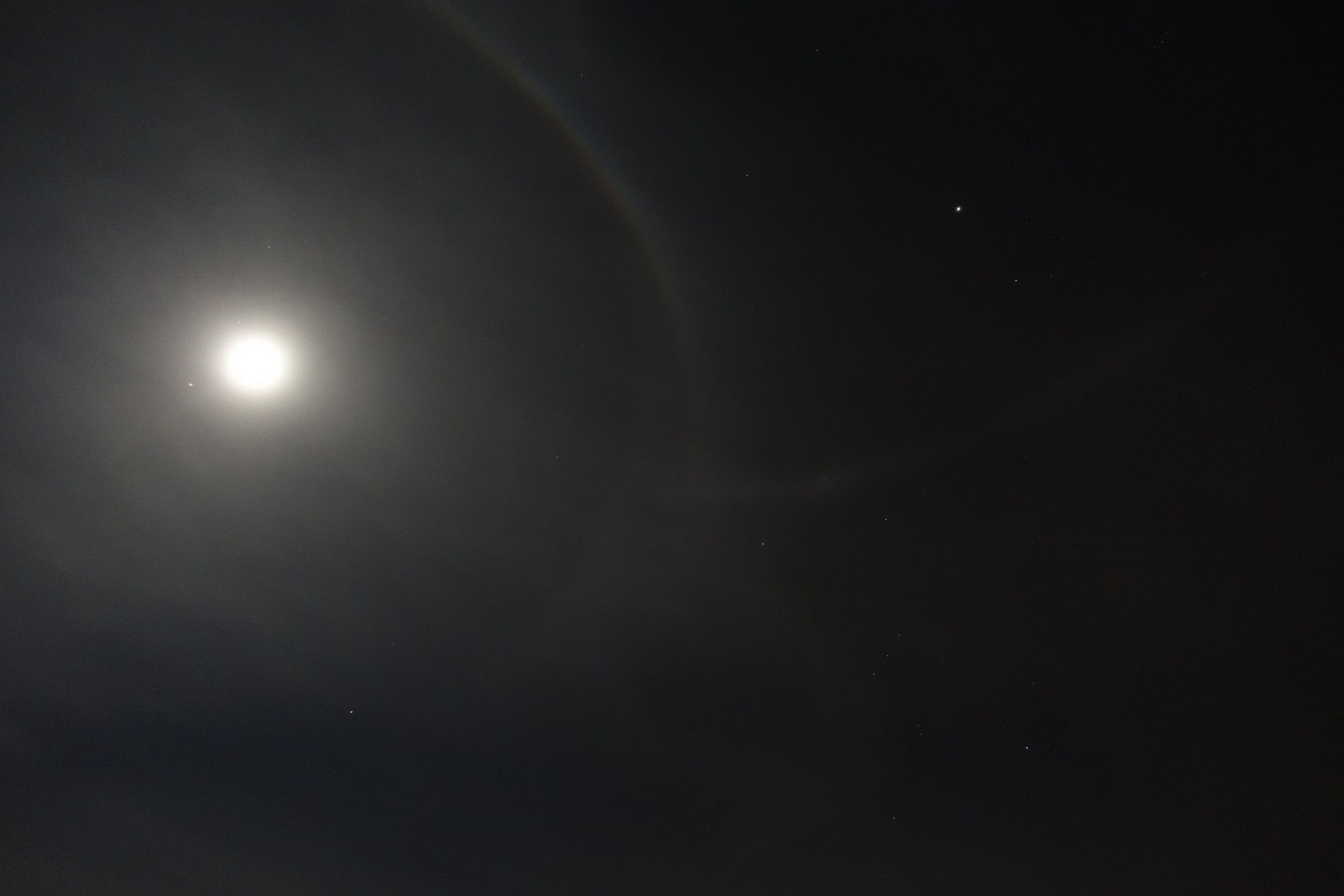 13.01.25 um 22:00 MEZ, Höhe Mond ca. 53°. Zunächst mal ein Halo des Monds, oben besonders ausgeprägt, ist der obere Berührungsbogen, fast deckungsgleich mit dem 21° Halo.