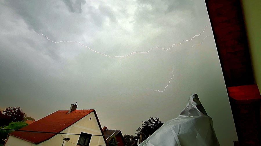 die gestrige überlappende Konvergenzschicht über dem Osten Österreichs brachte mächtig Blitz und Donner als auch den ersehnten Niederschlag über das Wiener Becken. Abends zeigte sich ein diffuser Regenbogen, der nur durch das aufgehellte Abendrot erzeugt wurde, die Sonne war nicht wirklich zu sehen. Einen Blitz konnte ich auch erwischen und sehr aufgestaute Wolken Richtung Wien.