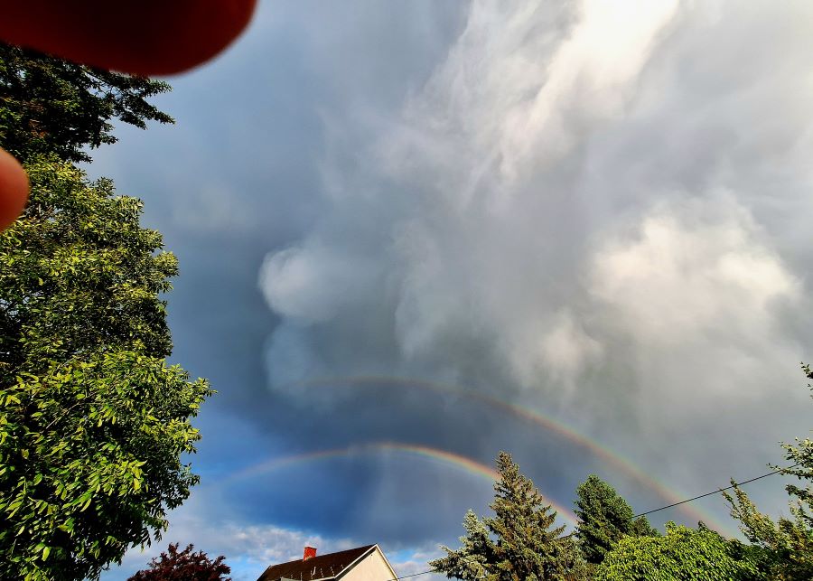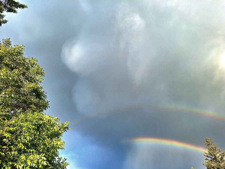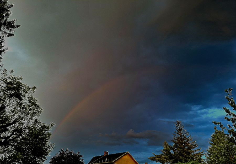 Gerade zog ein Schauer durch. In einer Wolkenlücke erzeugte die Sonne einen gespaltenen Regenbogen.