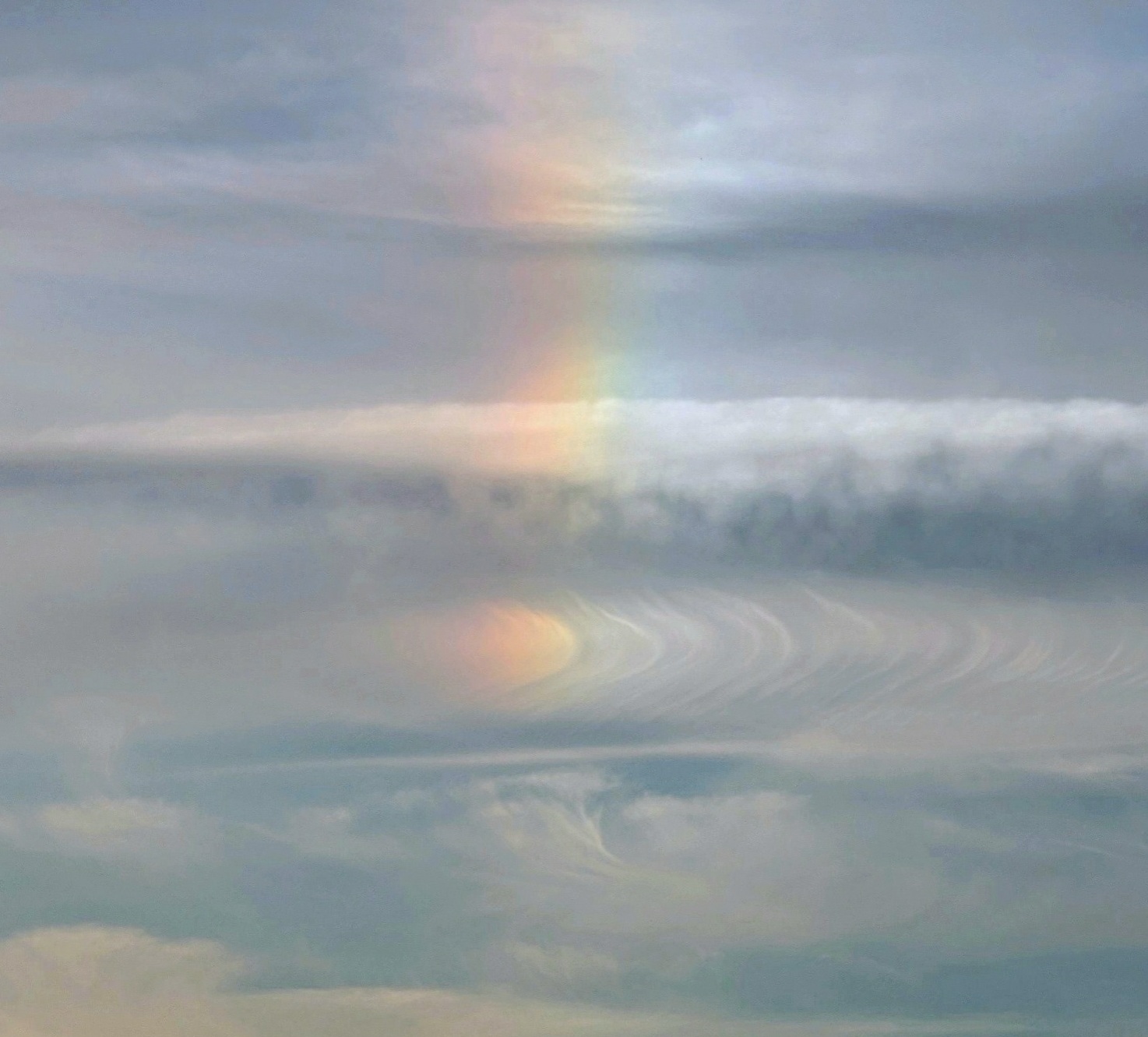 Sehr schönes Bild. Habe Zweifel obs ein "Regenbogen" war, schaut doch eher nach vertikal ausgedehnter Nebensonne aus (rechts von der Sonne), wie sie farblich verstärkt vor Sonnenuntergang auftreten kann. Müsste nur noch geringfügig über dem Horizont gewesen sein.