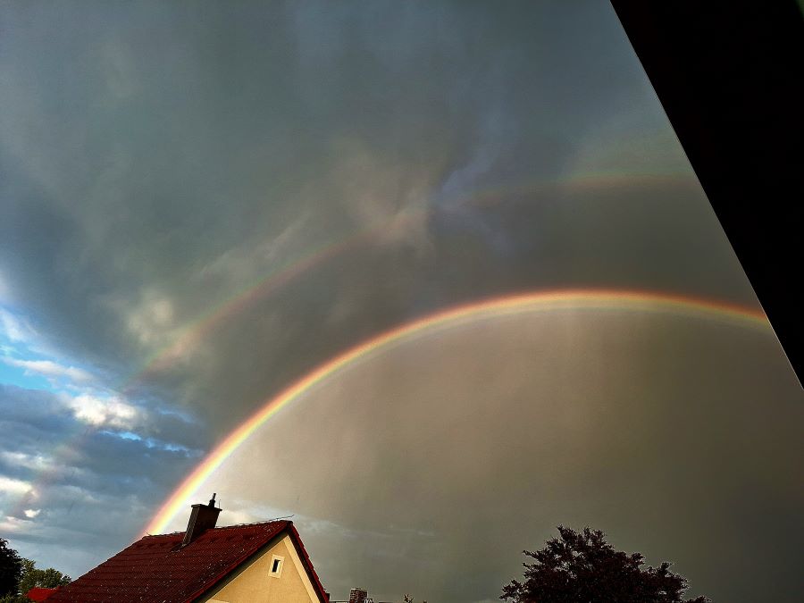 Das osteuropäische Tief brachte heute und gestern gute Schauer und Gewitter über das Wiener Becken. Gegen Abend vor Sonnenuntergang zeigte sich ein später Regenbogen in all seiner Farbenpracht, es waren sogar zwei, nach einer Schauerpause baute sich ein gleiches Spektakel nochmals sehr intensiv auf. Auch auffallend große Mamatus-Wolken waren dabei.