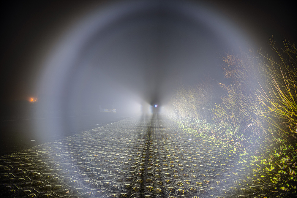 nachdem ich meine Geminidenbeobachtung in der Nacht vom 13. auf den 14. Dezember beendet hatte, "spielte" ich noch etwas mit dem Nebel auf der Wasserkuppe herum (der Gipfel war knapp drüber, nur wenige Meter weiter unten war dann aber schon dichter Nebel). Unter anderem konnte man einen sehr eindrucksvollen kreisrunden Nebelbogen produzieren: