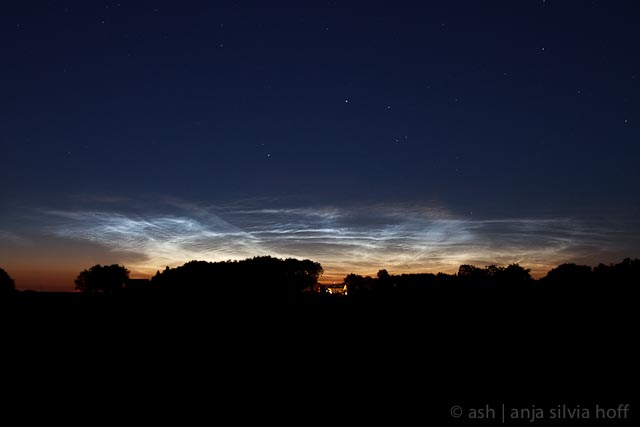 Mir ist beim Betrachten meiner (von der Kamera im Intervall-Modus ohne mich gemachten) Fotos aufgefallen, dass das leuchtende Band am Horizont ständig da war, allerdings gegen Mitternacht in der Höhe erst abnahm und nach Mitternacht wieder wuchs. Zeitraffer wird gerade gebastelt. Leider sind mir die schönen NLCs der Morgenstunden entgangen, da meine Kamera mit der Helligkeitszunahme nicht klarkam.