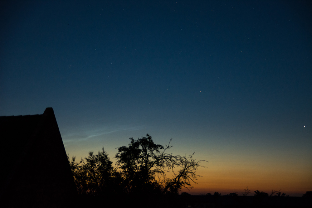 Mann war das eine schwere Geburt. Hatte innerlich schon fast mit dieser Saison abgeschlossen. Aber hier nun die erste Sichtung in der aktuellen Saison. Beobachte von 23:00 Uhr MESZ bis rund 24:00 Uhr MESZ. Die Ausdehnung der doch nur schwach leuchtenden Wolken ging relativ gut sichtbar von 340° über 0 bis ca. 10° und das bei einer maximalen Höhe von etwa 4°. Wenn man noch die nicht eindeutig zuzuordnende Aufhellung um linken Bereich, auf Bild zwei, als NLC annimmt, kommt man dann auf 320-0°- 10° bei gleicher Höhe. Die Helligkeit bekommt nach meiner Einschätzung max. eine 2, im linken angenommenen Bereich von 320-340° eine 1. Ansonsten war glücklicherweise der Mond noch unter dem Horizont, was die Sache doch etwas einfacher gemacht hat. Ansonsten gab es in den Morgenstunden bei klarem Nachthimmel keine weitere Sichtung.