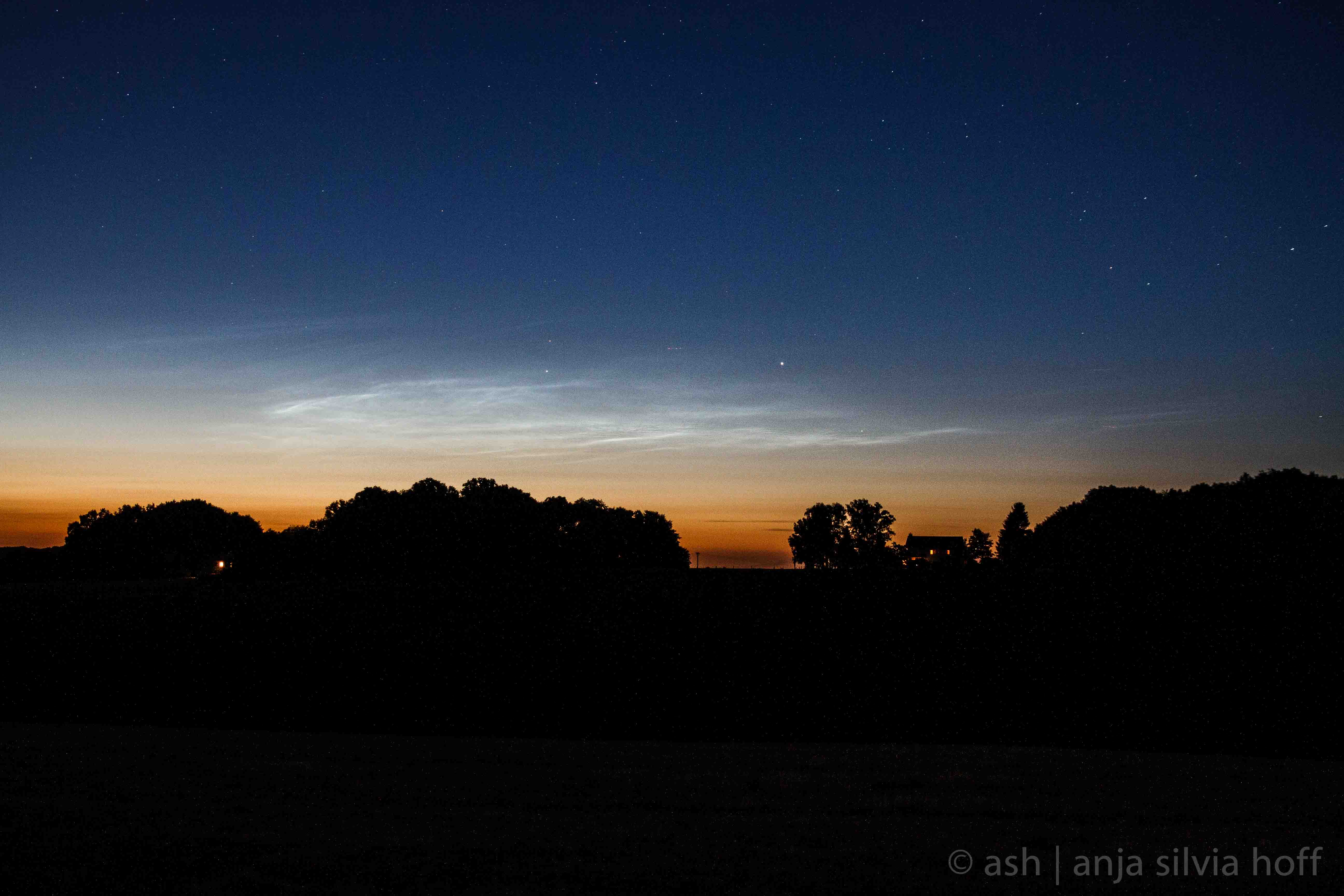 Mann war das eine schwere Geburt. Hatte innerlich schon fast mit dieser Saison abgeschlossen. Aber hier nun die erste Sichtung in der aktuellen Saison. Beobachte von 23:00 Uhr MESZ bis rund 24:00 Uhr MESZ. Die Ausdehnung der doch nur schwach leuchtenden Wolken ging relativ gut sichtbar von 340° über 0 bis ca. 10° und das bei einer maximalen Höhe von etwa 4°. Wenn man noch die nicht eindeutig zuzuordnende Aufhellung um linken Bereich, auf Bild zwei, als NLC annimmt, kommt man dann auf 320-0°- 10° bei gleicher Höhe. Die Helligkeit bekommt nach meiner Einschätzung max. eine 2, im linken angenommenen Bereich von 320-340° eine 1. Ansonsten war glücklicherweise der Mond noch unter dem Horizont, was die Sache doch etwas einfacher gemacht hat. Ansonsten gab es in den Morgenstunden bei klarem Nachthimmel keine weitere Sichtung.