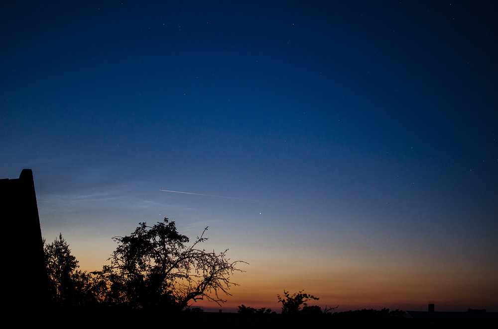 Gestern abends war ich bei der Beobachtung erfolglos. Möglicherweise waren die NLCs doch zu niedrig, um über den Böhmerwaldkamm zu reichen. Claudias Angaben nach erreichten sie nur 8° Höhe. Das Azimut hätte am Schluss noch reichen können, allerdings waren im NNW zahlreiche Dunststreifen. Ob ihre Helligkeit von 1 - 2 (siehe Beitrag von Claudia) da noch gereicht hätte? Vielleicht habe ich auch die Beobachtung zu früh abgebrochen, bis 22:45 MESZ waren sie aber noch nicht zu sehen. Und bei uns im Süden und doch so weit östlich wäre es im NNW schon dunkel genug gewesen. Auf den Bildern der Webcams von http://webcam.sumava.eu/ tauchen sie nicht auf (es ist die Bildqualität aber auch nicht berauschend).