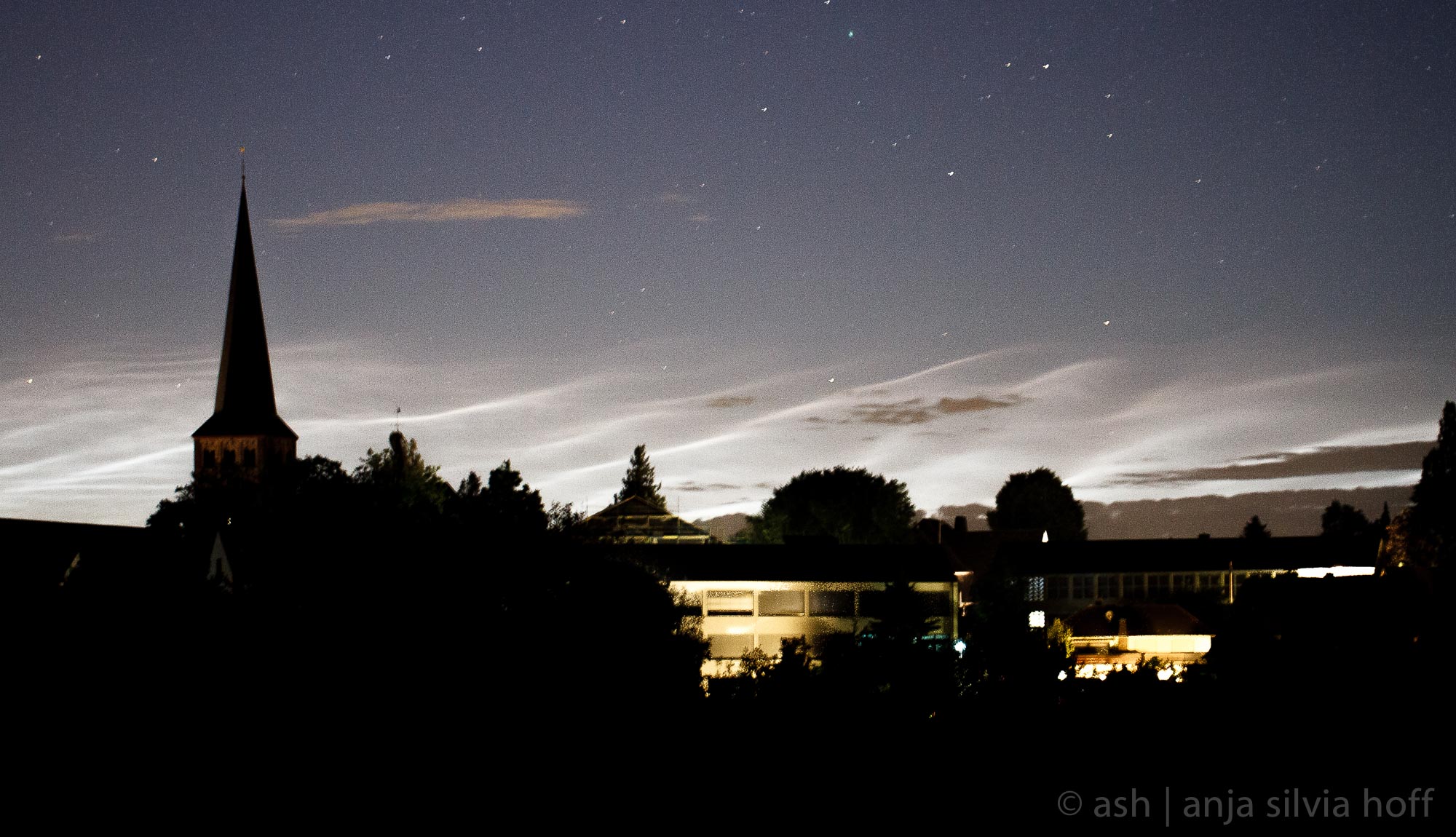 auch in Wardenburg (Höven) ließen sich die NLC ab der Abenddämmerung beobachten. Um ca. 22:45 waren schon die ersten Strukturen, die ich aber erst als Cirrus-Wolken abtat, da es sich hierbei um "dicke" Bänder ohne feine Strukturen handelte und diese eigentlich genau so aussahen wie die Cirren, die noch am Himmel hingen, und die NLC sehr weit im Osten standen.