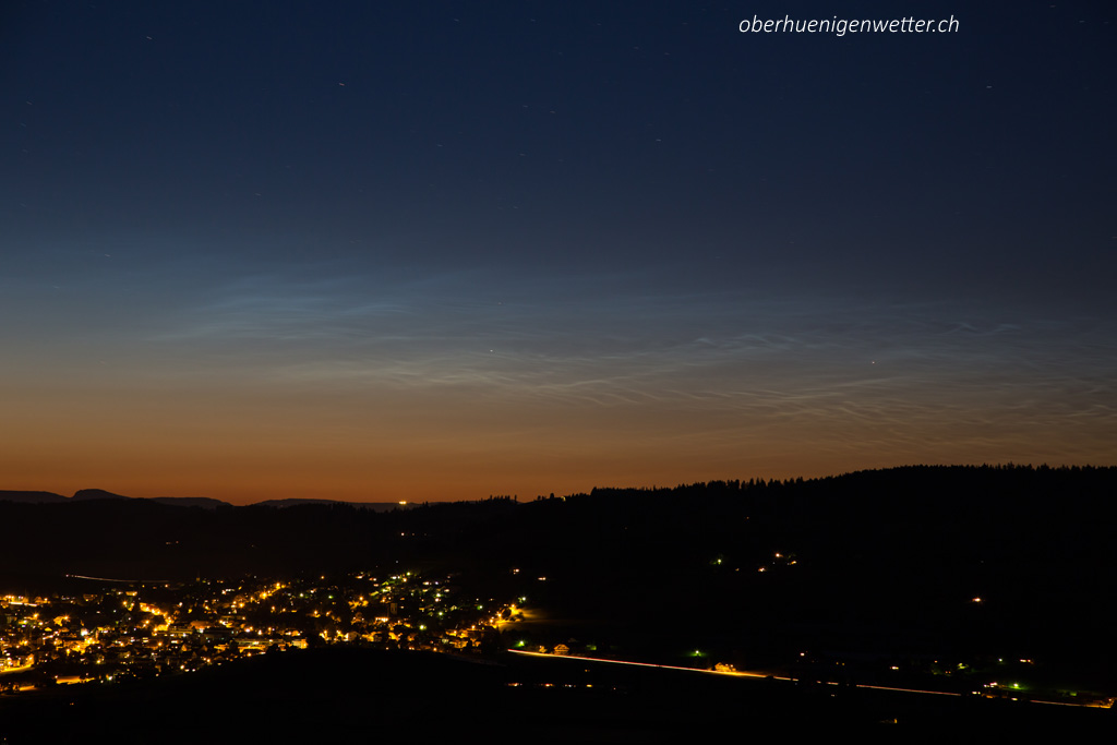 auch in Wardenburg (Höven) ließen sich die NLC ab der Abenddämmerung beobachten. Um ca. 22:45 waren schon die ersten Strukturen, die ich aber erst als Cirrus-Wolken abtat, da es sich hierbei um "dicke" Bänder ohne feine Strukturen handelte und diese eigentlich genau so aussahen wie die Cirren, die noch am Himmel hingen, und die NLC sehr weit im Osten standen.