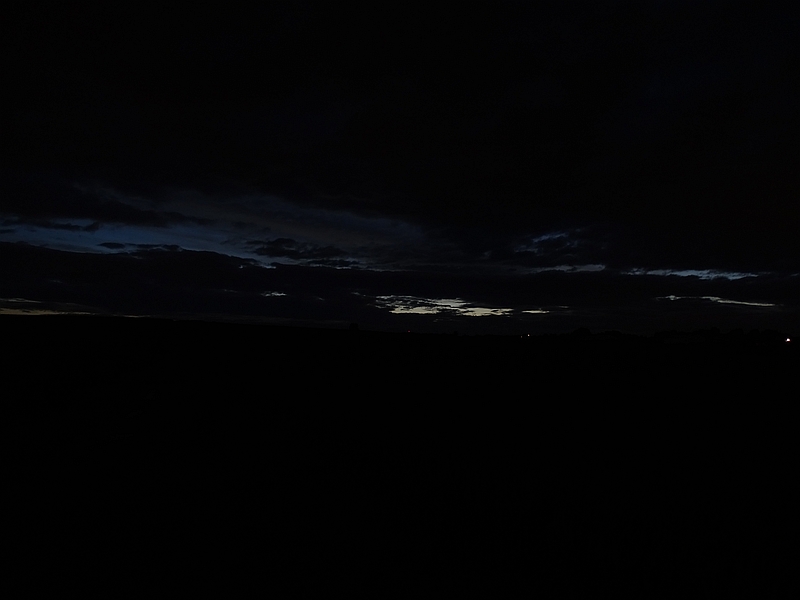 wir sind auf der Suche nach Wolkenlücken von Oberursel in die Wetterau gefahren und schließlich auf einem Feldweg bei Karben gelandet. In den homöopathischen Wolkenlücken im NW waren eindeutig keine NLCs sichtbar (1. und 2. Foto). Richtung N und NE war alles horizontnah alles dicht, weshalb nicht auszuschließen ist, dass dort doch etwas war. Ein hochreichendes Display ist jedenfalls definitiv auszuschließen. Ansonsten waren da nur noch das weit entfernte Aufblitzen eines Feuerwerks und ein wolkenumkränzter Mond (3. Foto). Auf dem Rückweg haben wir ein angefahrenes Reh gefunden. Nachdem wir die Polizei gerufen hatten, haben wir die Stelle gesichert. Noch während wir mit 110 telefoniert hatten, hatte ein weiteres Auto das Tier endgültig in die ewigen Jagdgründe befördert und dessen Innereien über die Fahrbahn verteilt. Das Foto, das meine Freundin von der Situation gemacht hat, wollt Ihr wahrscheinlich nicht sehen. Kurz nach dem Streifenwagen traf dann überraschenderweise der etwa 20jährige "Täter" in Begleitung von Mutti ein. Musste sich von den Beamten dann erst einmal belehren lassen, dass er die Unfallstelle nicht einfach hätte verlassen dürfen.