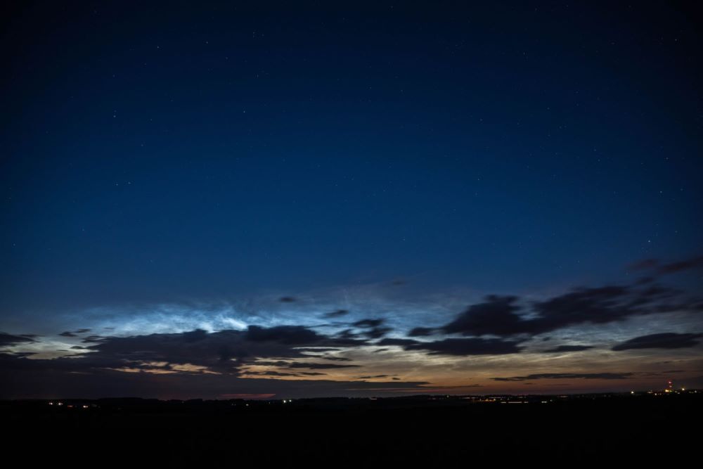 ja, was soll man sagen… ein NLC-Abend der Extraklasse! ! Die Kumuluswolken bildeten zunächst einen eindrucksvollen Kontrast zu den NLCs, bevor letztere von ersteren komplett im weiteren Verlauf verdeckt wurden… Höhe über dem Horizont um die 12° bis 15°…! Die ersten Linien und Rippen wurden noch während der hellen Dämmerung sichtbar!