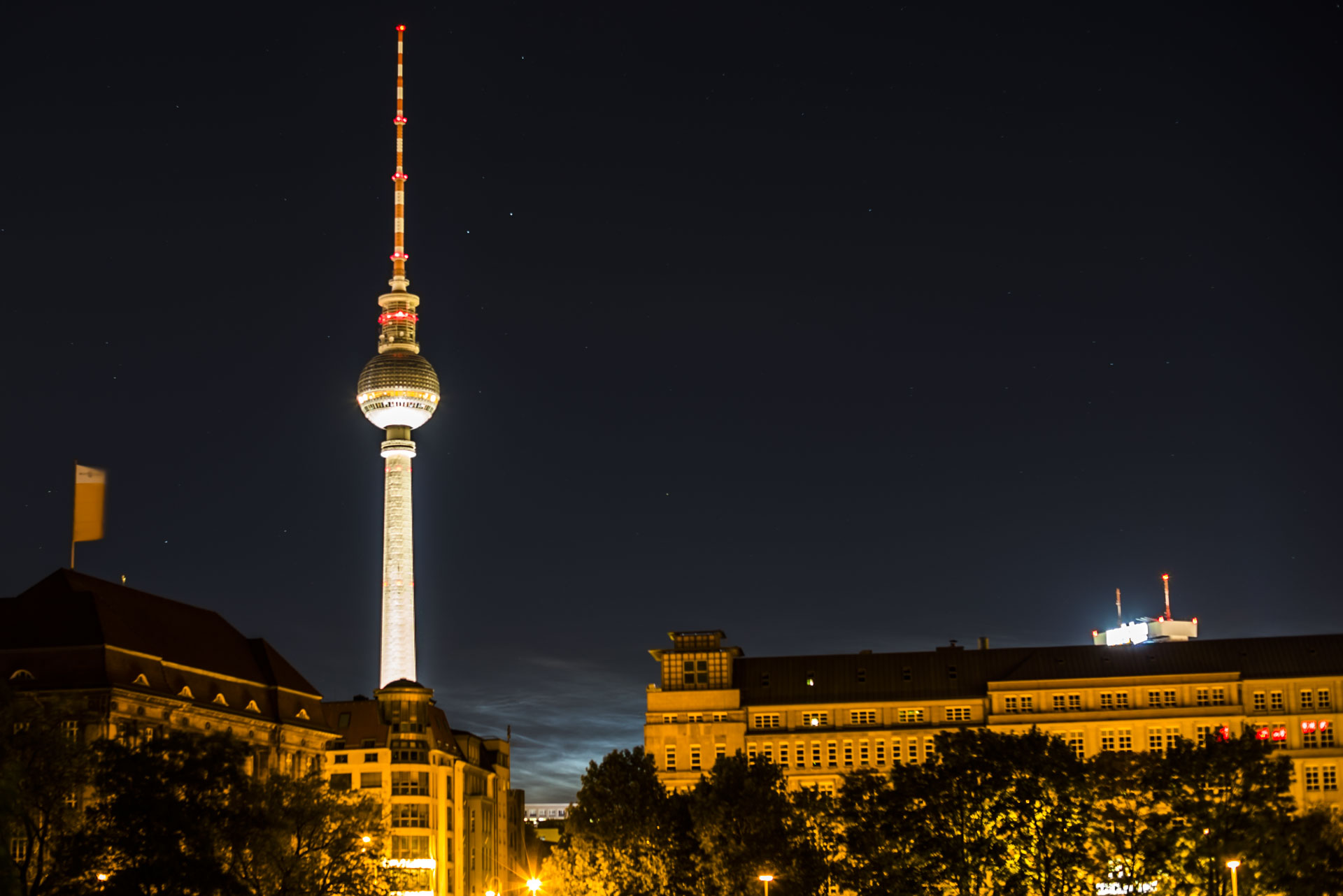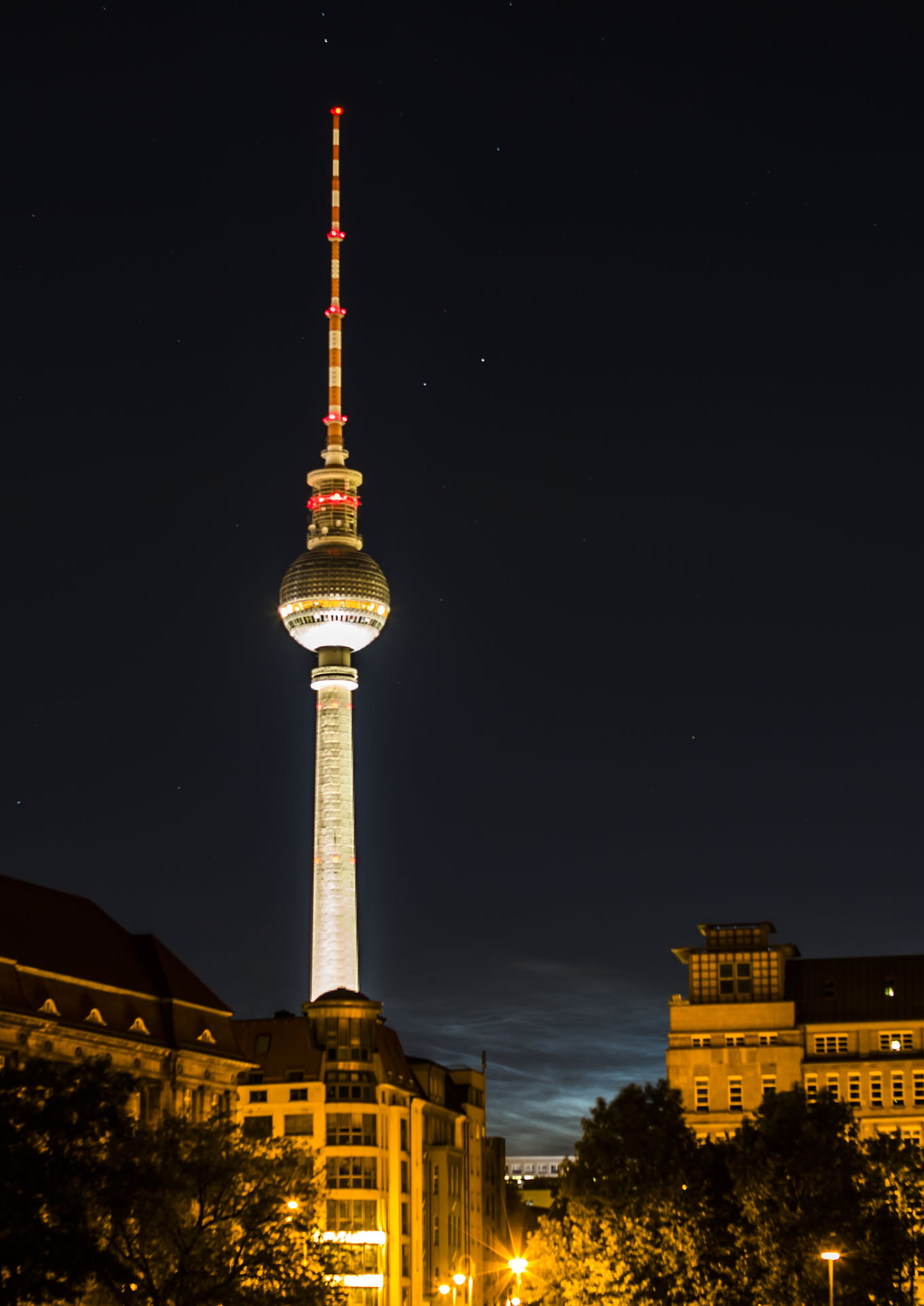 ich wollte mich gerad bettfein machen, da hab ich hier von den spektakulären Displays gelesen. Also hab ich mich kurz vor 23 Uhr Ortszeit auf in die Innenstadt Berlins (Mitte, Kreuzberg) gemacht. Wirklich ideal waren die Bedingungen aufgrund der starken Lichtverschmutzung und der Bewoelkung rund um den Berliner Fernsehturm also nicht mal ansatzweise. Trotzdem konnte man in Wolkenlücken die NLCs auch visuell mit dem Auge ausmachen, wenn auch nicht so spektakulär wie bei einigen Mitstreitern hier... Die Fotos sind allesamt zwischen 23 Uhr und 23:30 Uhr entstanden.