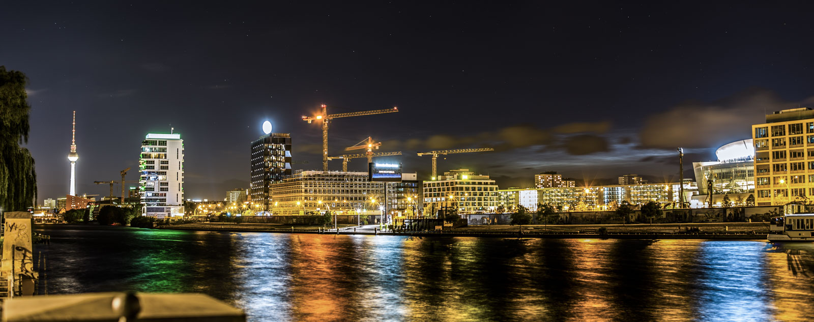 1. Eastside-Gallery, Berlin (schwache Strukturen sind hinter den Baukrähnen zu erahnen. Klar sichtbar ist NLC auf der rechten Bildseite zu sehen.)