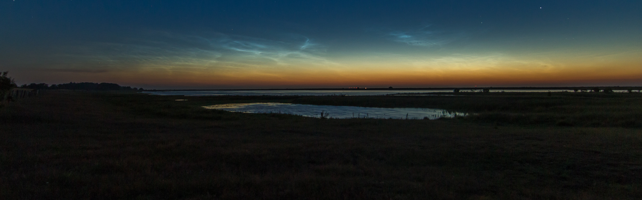 Hier bei Bremerhaven war es zunächst noch recht stark bewölkt, klarte jedoch nach 1 Uhr MESZ nordöstlich von hier zunehmend auf. Deswegen fuhr ich dann ca. 25 km nach Osten Richtung Köhlen und Großenhain. Schon zu Hause in Wolkenlücken und auf dem Weg waren die NLC mit Helligkeit 4 beeindruckend. Zwar zogen auch an meinem endgültigen Standort nördlich von Großenhain noch Schleierwolken durch, doch die leuchteten rot/pink in der Dämmerung und verschönerten den Gesamteindruck sogar noch :)