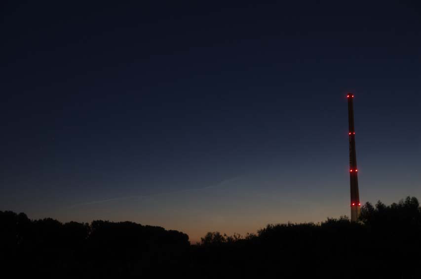 Am Abend konzentrierte ich mich frühzeitig auf den Zenitbereich, Westen, Süden und hoch im NW. Irgendwie passierte nichts, außer schon Pseudoflecken in den Augen. Dann Standortwechsel und auf einmal waren da NLC in NNE bis weit nach NE (min. AZI 050 - und noch nichts im Forum - dachte schon ich hätte was verpaßt...). Nur die Helligkeit war nicht so dolle. Für eine 2 hat es dann noch gereicht. Irgendwann reichten die NLC aus der hellen Dämmerung heraus bis deutlich nach NW (ab etwa 23:13 UT dorthin "wachsend") mit guten Höhen von min. 10° und bald mehr und Max.-W-AZI bei ca. 300.