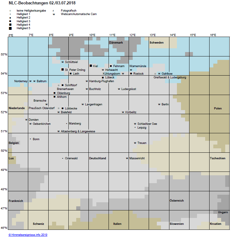 die Nacht 02./03.07.2018 brachte eine ganz ähnliche Situation wie die vorangegangene. Auch sie ist durch zahlreiche Beobachtungen hervorragend belegt (Abb. 1). Dazu trug neben dem in ganz Mitteleuropa wiederum fast wolkenfreien Himmel (Abb. 2) erneut (im Hinblick auf die menschlichen Beobachter) bei, dass es sich um eine Wochenend-Nacht (Samstag/Sonntag) handelte. Diesmal erreichte das im Norden Deutschlands durchaus eindrucksvolle Display seine beste Entwicklung bereits ab der astronomische Mitternacht, als Helligkeiten bis zu 4 gemeldet wurden. Dank wiederum erfreulich vieler Angaben zu Azimut und Höhe lässt sich die Lage des NLC-Feldes gut rekonstruieren (Abb. 3). Die hierfür verwendeten Daten decken den Zeitraum zwischen 00:26 und 03:35 MESZ ab. Somit gibt Abb. 3 also den Aufenthaltsraum der Südkante des Feldes im genannten Zeitabschnitt wieder. Da das Display auch mit fortgeschrittener Morgendämmerung nirgends höher als 14 Grad stieg, ist in diesem Fall nicht nur die sichtbare (durch den Terminator in der Mesopause-Region) bedingte Südkante, sondern die tatsächliche physikalische repräsentiert.