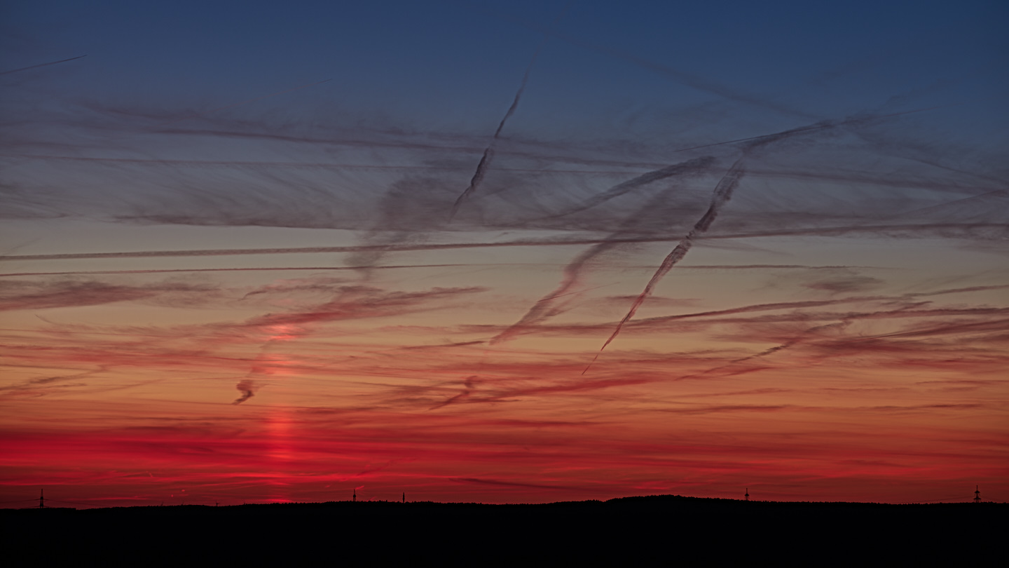 Hier zuerst ein Ausschnitt, ca. die Hälfte der Breite: Und hier habe ich die ganze Vorstellung ins Bild bekommen Um 21:59 war übrigens auch ein interessanter Sonnenuntergang, von der Sonne war nur noch ein roter Streifen am Himmel zu sehen. Wahrscheinlich Reflexion der untergehenden Sonne an Eiskristallen? Muss gelegentlich nachforschen wie das Phänomen genannt wird oder kennt ihr den Namen?